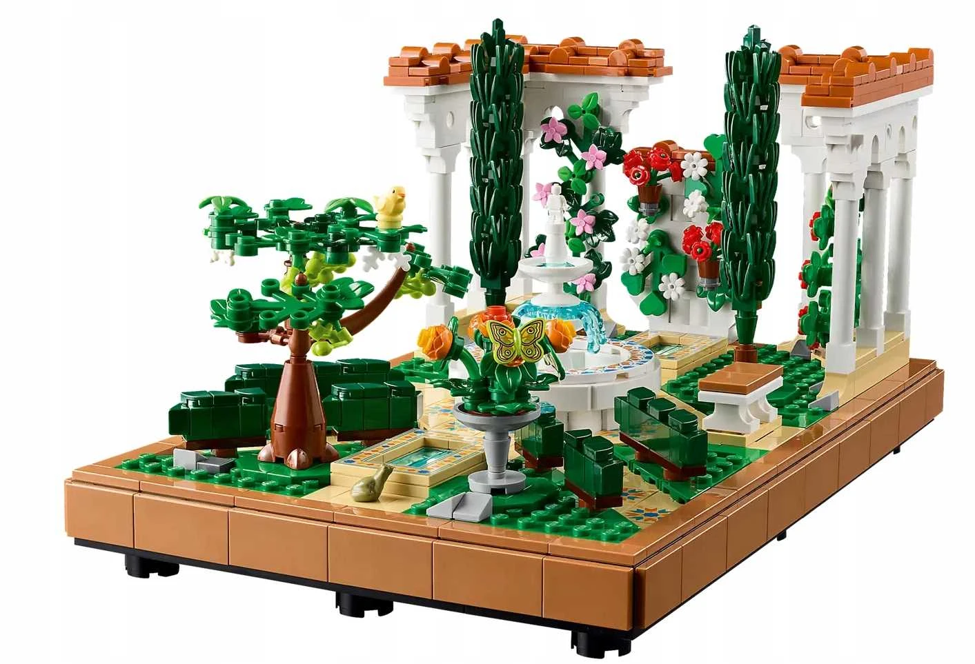 ➡️Fontanna w ogrodzie LEGO® zawiera piętrową fontannę, misę, dwa cyprysowe drzewka, ukwiecone winorośle, cztery pergole i ścieżkę z płytek, a także figurki ćmy, ptaka i żaby