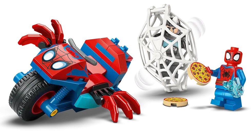 ✅ Dynamiczna scena akcji: motocykl Spider-Mana wyposażony w lekkie nadwozie i skrzydła.