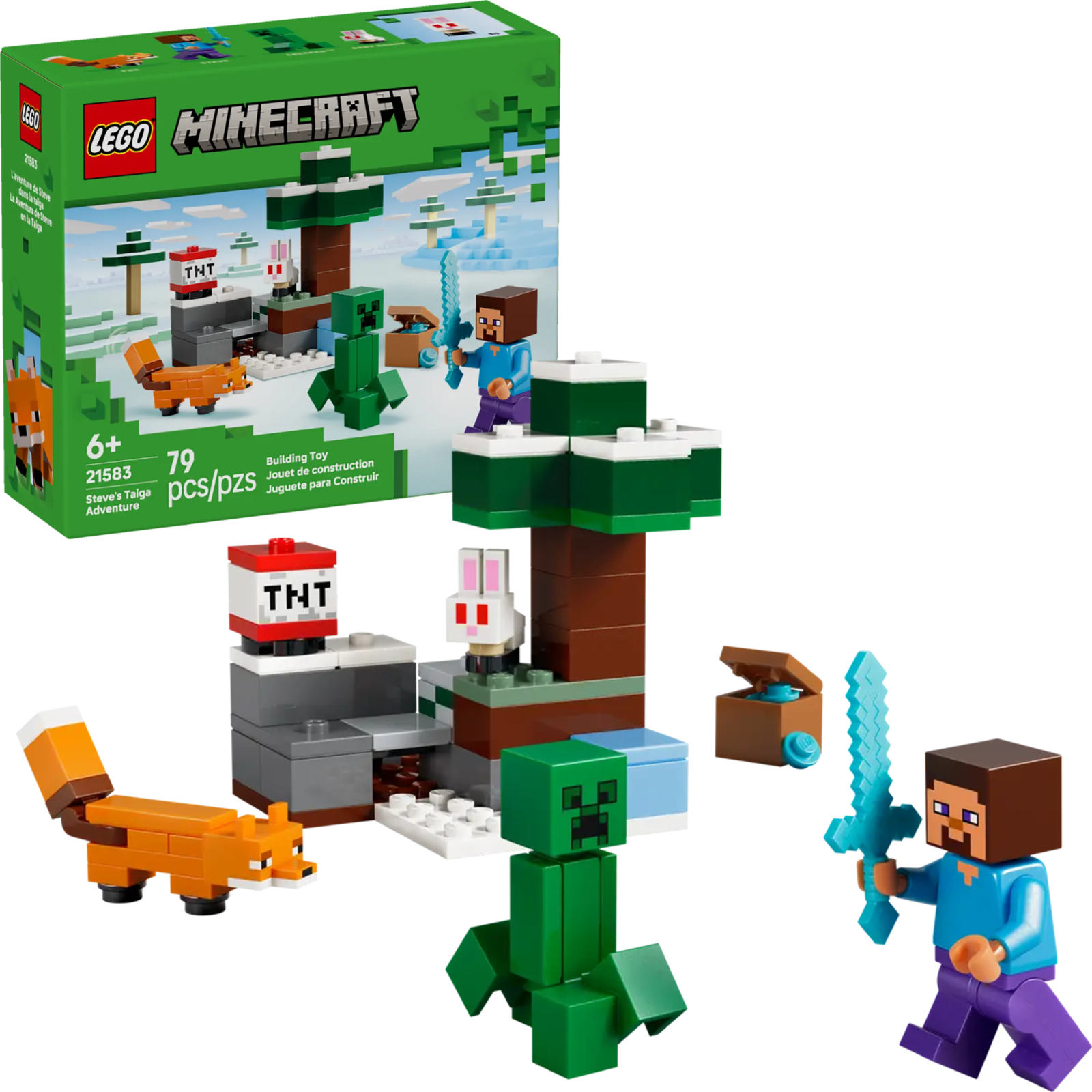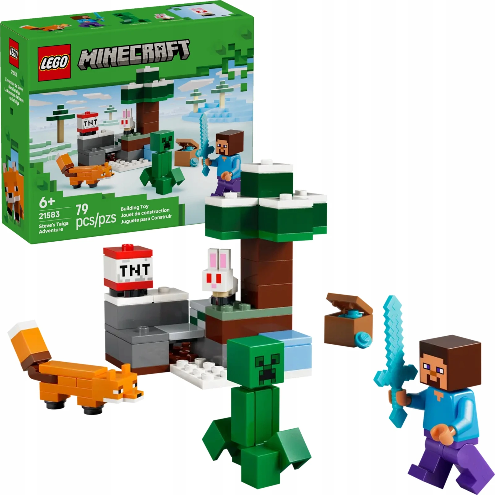 Zestaw LEGO® Minecraft 21583 – Przygoda Steve’a w tajdze to dynamiczny model stworzony dla dzieci od 6 lat, łączący elementy akcji, przygody i eksploracji w klimacie charakterystycznego biomu tajgi. Zbuduj krajobraz z gęstymi świerkami, śniegiem i trawiastym poszyciem, użyj TNT by rozbić skały i odkryj skarby – bloki diamentu ukryte pod ziemią – a następnie schowaj je w skrzyni. Zestaw zawiera Steve’a, Creepera, lisa oraz małego króliczka LEGO®, co daje możliwość wielowymiarowej rozgrywki pełnej walki i przyjaźni. Dzięki aplikacji LEGO Builder budowanie jest łatwe, instrukcje interaktywne, a zabawa – satysfakcjonująca. EAN produktu to 5702018034071, premiera zaplanowana na rok 2026.