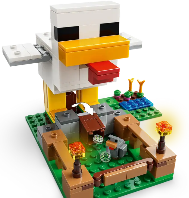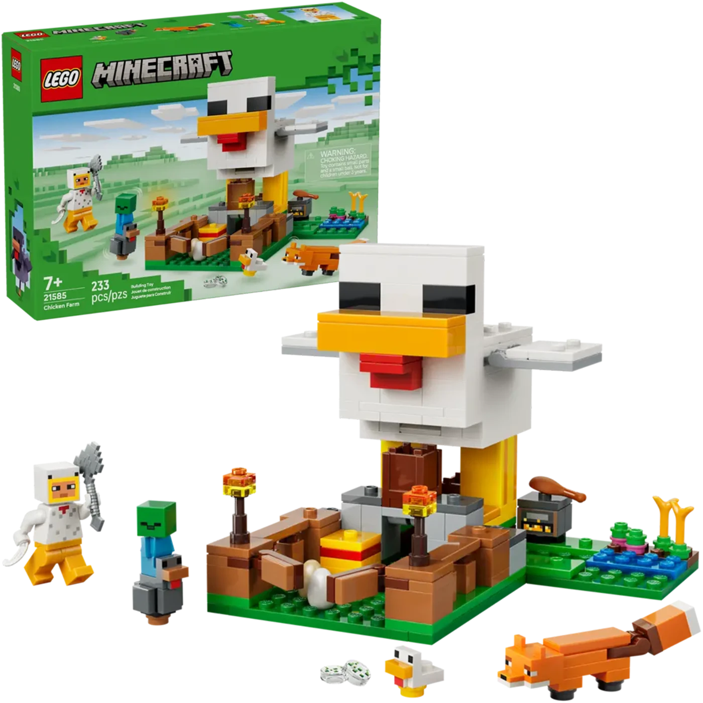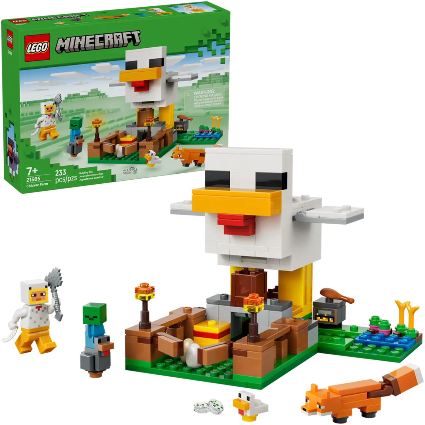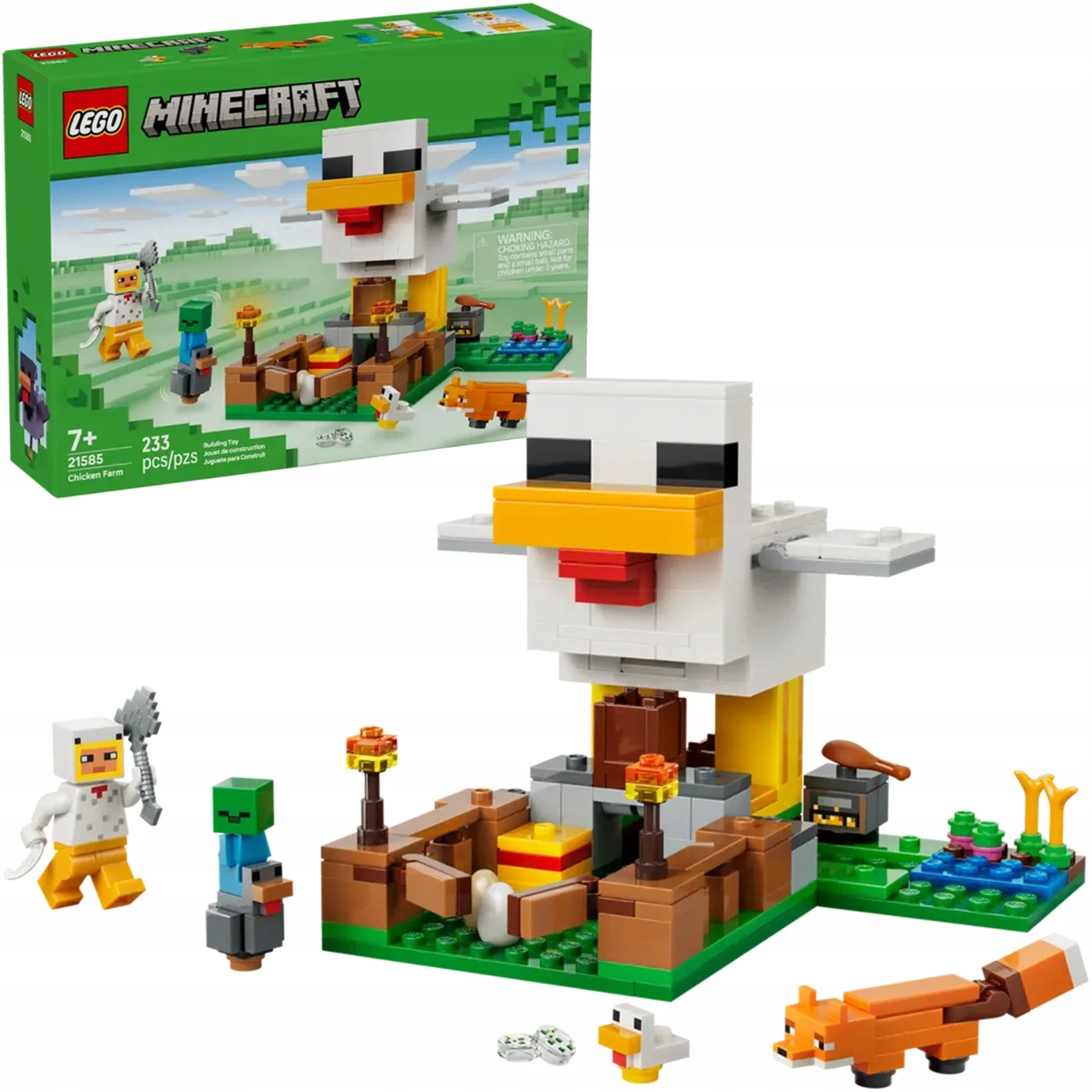 LEGO® Minecraft® Chicken Farm 21585 to zestaw liczący 233 elementy, idealny dla dzieci w wieku 7 lat i więcej. Przenosi świat farmy z gry Minecraft® do rzeczywistości: zbudujesz kurnik w kształcie kurczaka z ruchomymi skrzydłami, otwieraną bramką i mechanicznym mechanizmem wysypującym jajka oraz ziarna. W zestawie znajdują się cztery postaci – między innymi Chicken Fan, baby zombie, lis oraz dwie kury – jedna dorosła, jedna pisklę. Dodatki takie jak pochodnie, siano, smoker, , pióro i siekiera podkreślają klimat Minecraft.