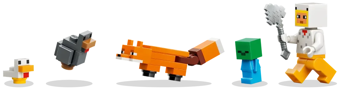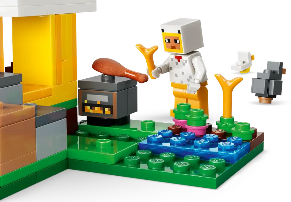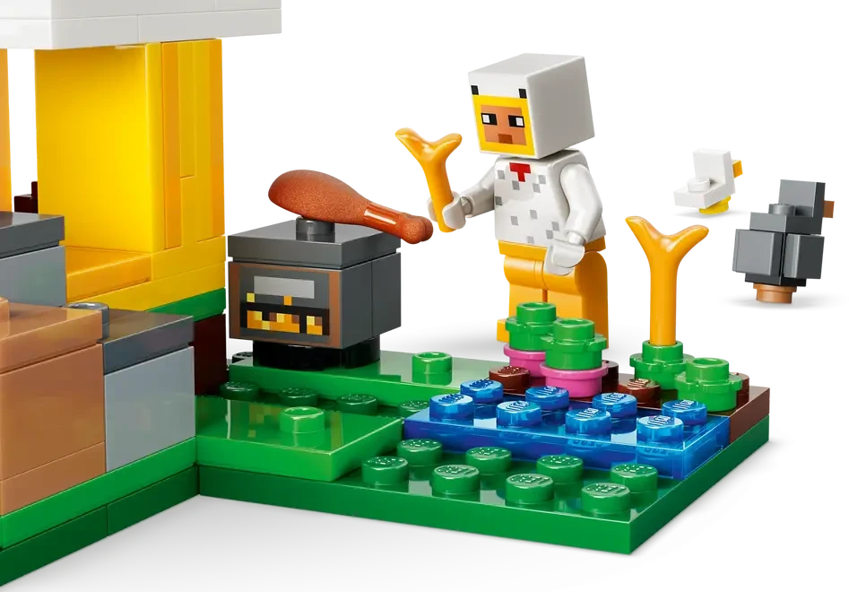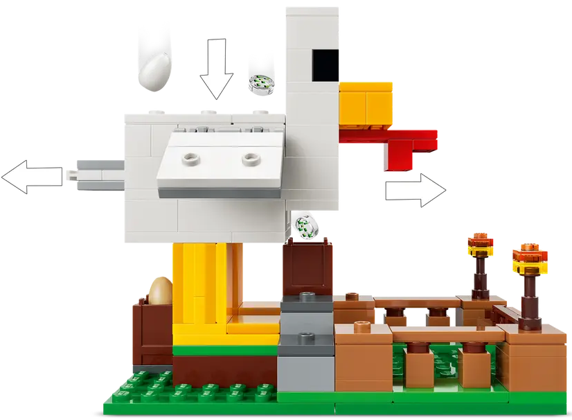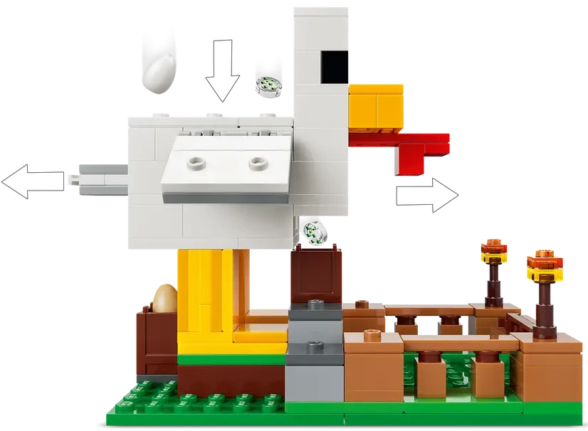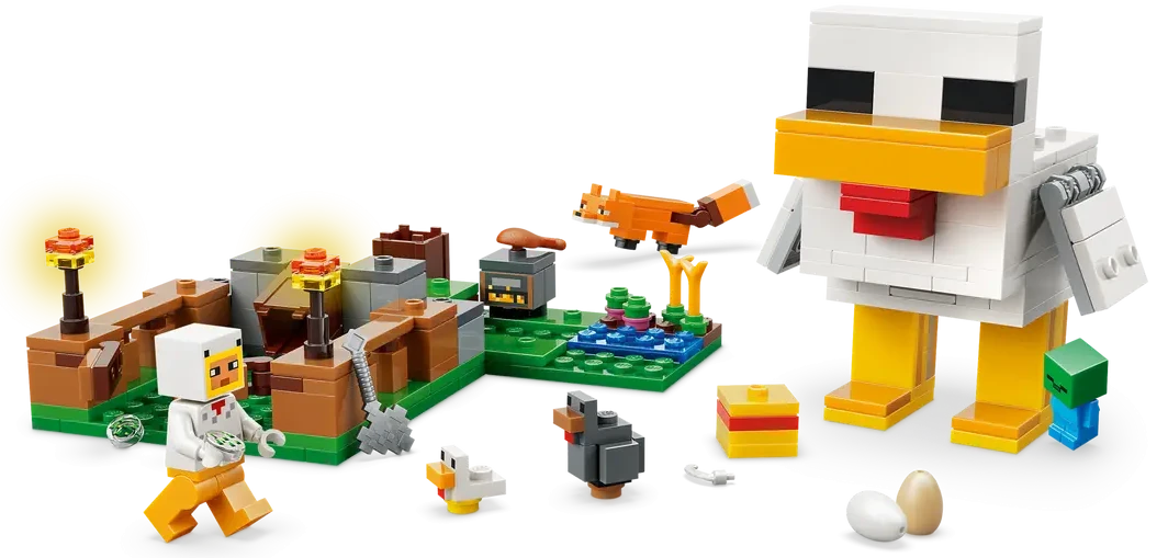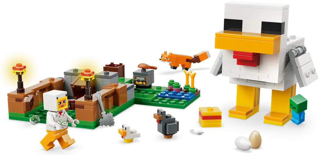 LEGO® Minecraft® Chicken Farm 21585 to zestaw liczący 233 elementy, idealny dla dzieci w wieku 7 lat i więcej. Przenosi świat farmy z gry Minecraft® do rzeczywistości: zbudujesz kurnik w kształcie kurczaka z ruchomymi skrzydłami, otwieraną bramką i mechanicznym mechanizmem wysypującym jajka oraz ziarna. W zestawie znajdują się cztery postaci – między innymi Chicken Fan, baby zombie, lis oraz dwie kury – jedna dorosła, jedna pisklę. Dodatki takie jak pochodnie, siano, smoker, , pióro i siekiera podkreślają klimat Minecraft.