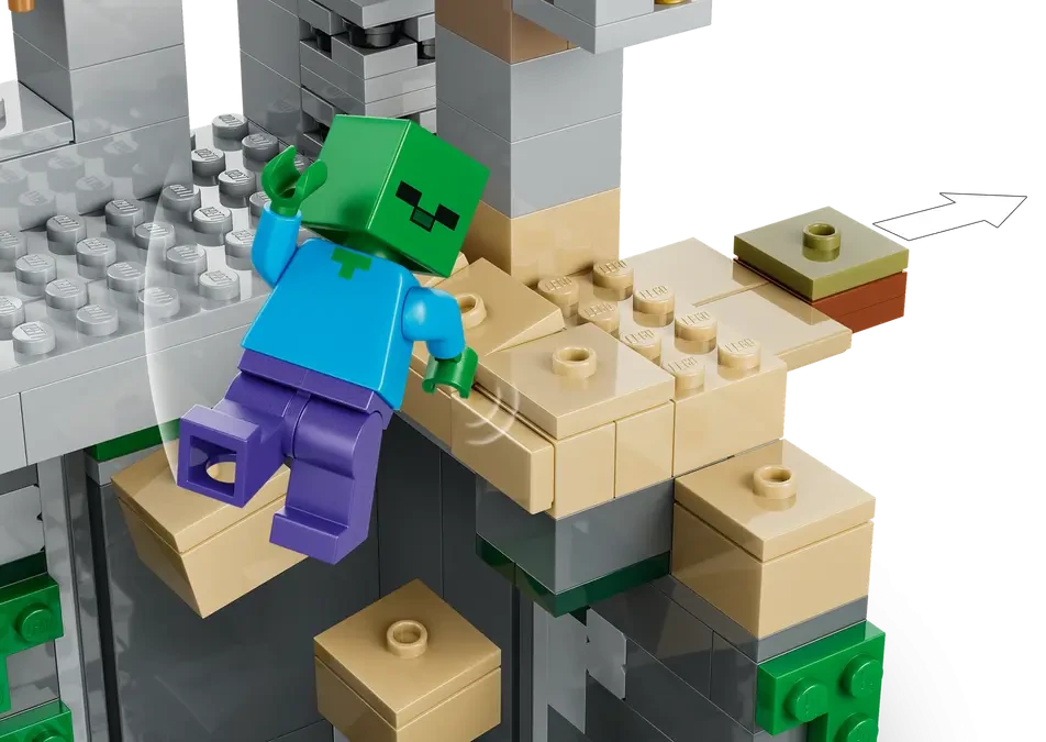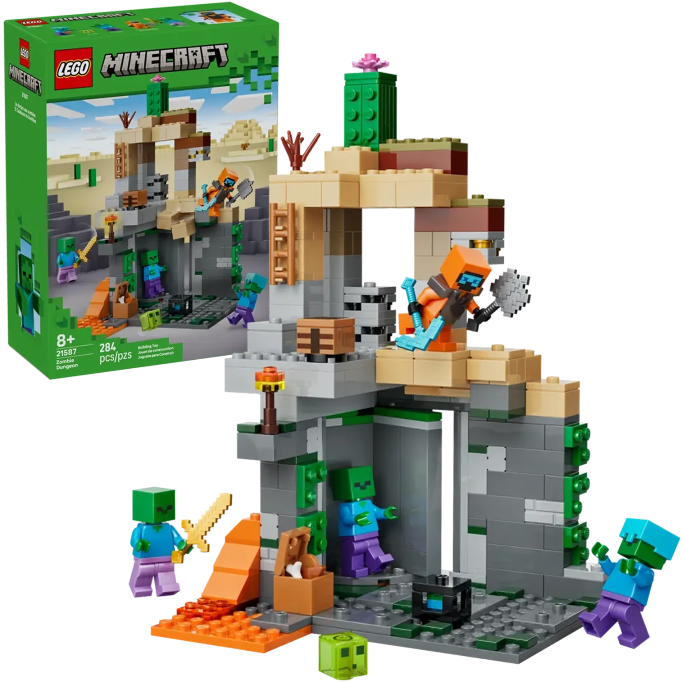 Oto 21587 – LEGO® Minecraft® Zombie Dungeon, zestaw pełen akcji, przygód i strachów w mrocznym lochu. Zanurz się w **świat Minecrafta** z unikalną estetyką **desert biome**, podziemną architekturą i postaciami prosto z gry. Odważny **Wastelands Wanderer**, uzbrojony w **diamond pickaxe**, **mace** i pełną zbroję **netherite**, staje naprzeciw trzem przerażającym **zombie**, w tym jednego z **enchanted leggings i złotym mieczem**, a także jednego z **diamentowym hełmem**. W środku lochu jest **obracana komnata rodząca zombie** oraz ruchoma ściana, która wywołuje **spadające głazy** – idealna do zabawy i odgrywania scen.