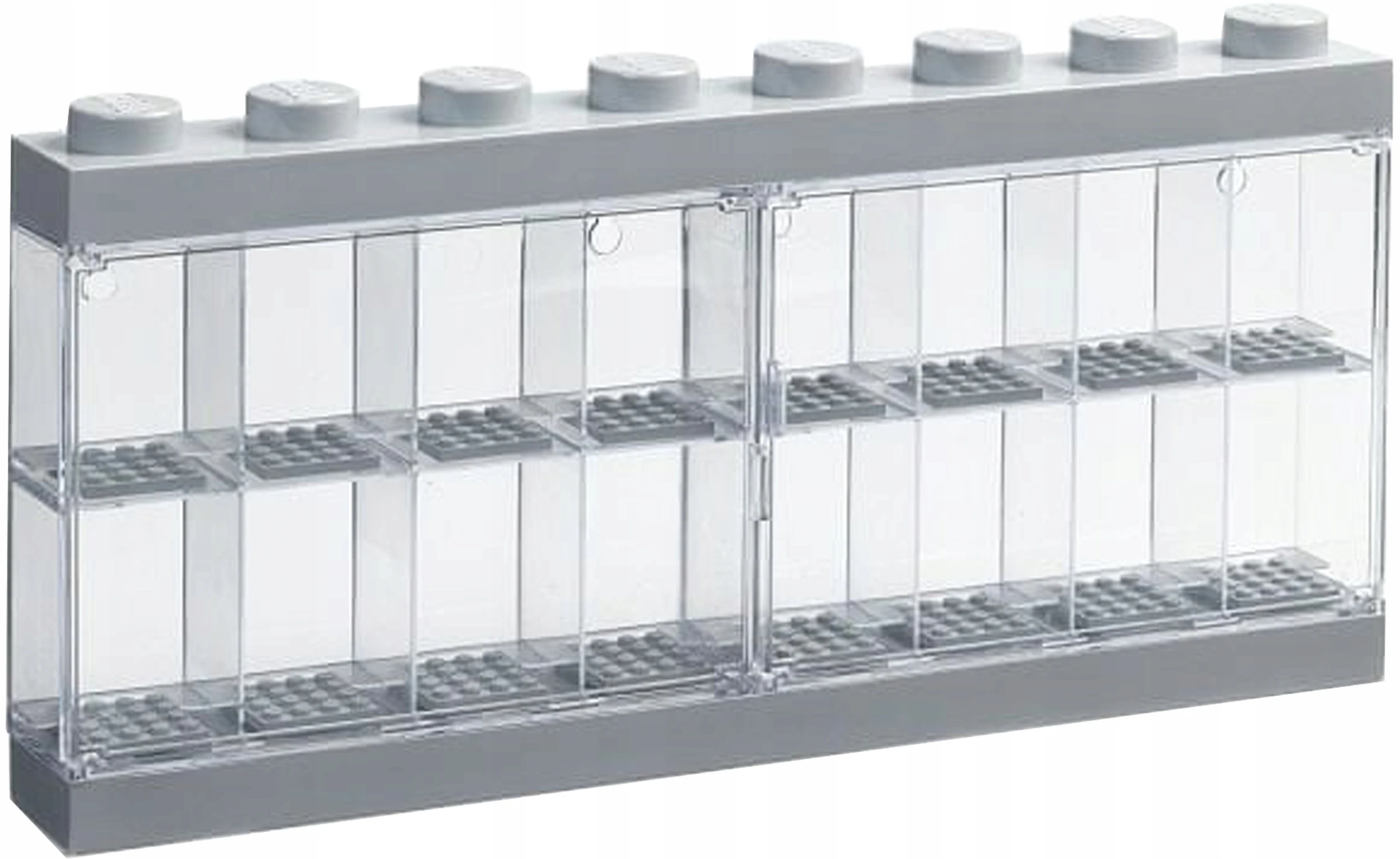 ➡️ Witryna ma szesnaście szarych płytek konstrukcyjnych, dzięki czemu możesz ustawić minifigurki na dwóch poziomach, w osobnych przezroczystych przegródkach z oddzielnymi drzwiczkami