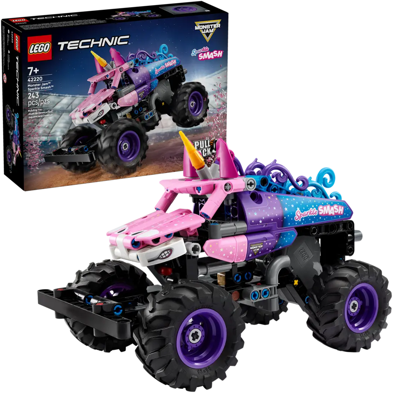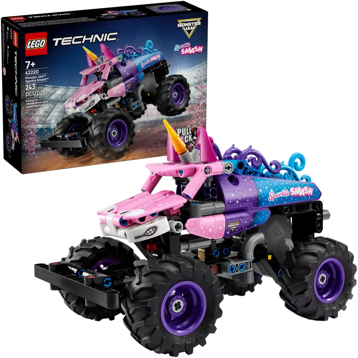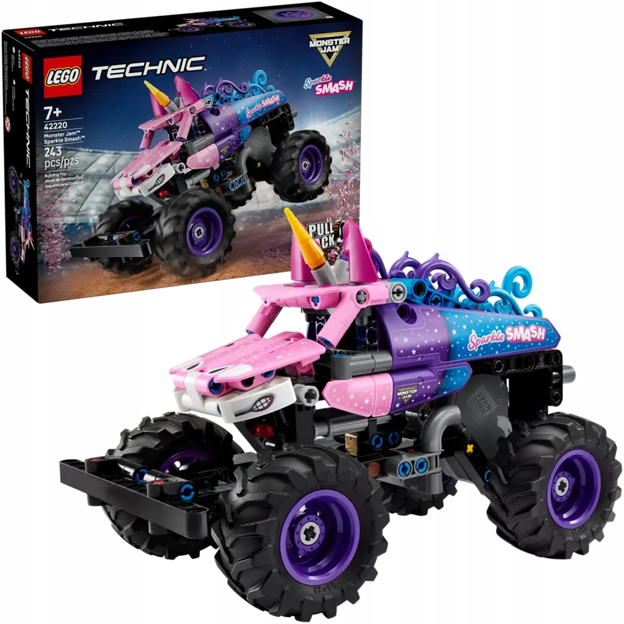 - Nazwa zestawu LEGO Technic 42220 Monster Jam Sparkle Smash z napędem typu pull-back