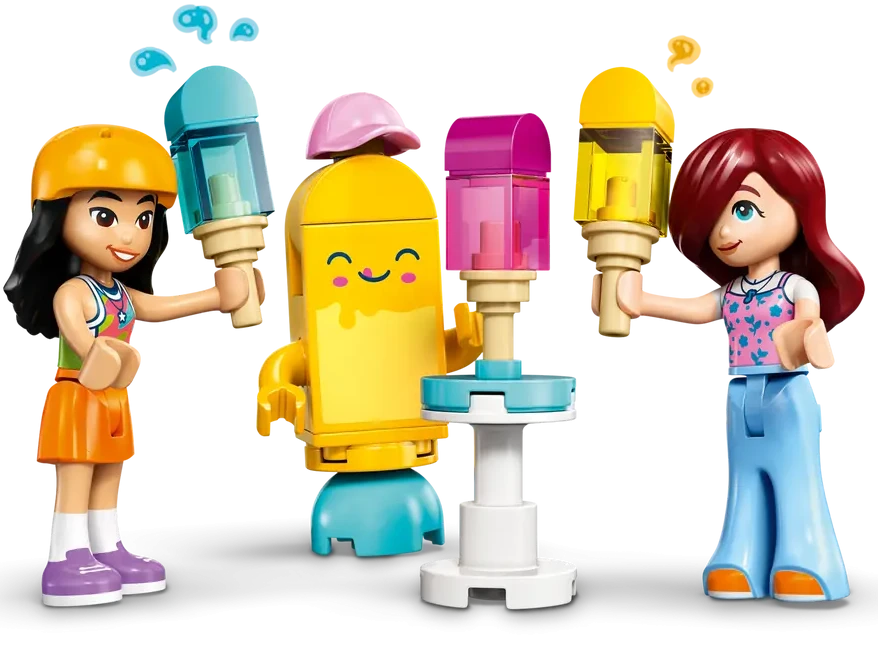 Zestaw LEGO® Friends 42692 Stoisko z lodami i balonami oferuje radosną przygodę w parku — dzieci wcielają się w sprzedawców i klientów, bawiąc się w role, opowieści i swoje własne historie. W skład wchodzi stylizowany pojazd rowerowy z przyczepą jako mobilne stoisko, stół do siedzenia, oraz różnorodne akcesoria, w tym mini-laleczki Liann i Paisley, maskotka lodówka, kasa, telefon, menu i wiele balonów. Dzięki temu zestaw nie tylko buduje, ale i inspiruje — idealny dla dzieci, które uwielbiają tworzyć i odgrywać scenki.