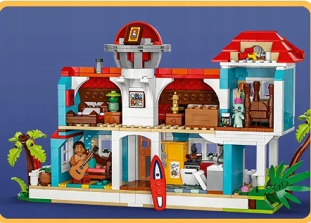 LEGO, Disney, Domek na plaży, Lilo i Stitch, zestaw LEGO, zabawki dla dzieci, konstrukcja LEGO, kreatywna zabawa, minifigurki LEGO, fani Disneya, prezent dla dziewięciolatków, zabawa w odgrywanie ról, statek kosmiczny, domek dwupiętrowy, przygody na plaży, deski surfingowe, lalka Strupka, gramofon LEGO, postacie Disney, LEGO Builder, aplikacja LEGO, intuicyjne instrukcje, model ozdobny, domek z filmów, zabawa kreatywna, nauka przez zabawę, akcesoria filmowe, pięć postaci LEGO, domek bajkowy, rozwój umiejętności, zestaw konstrukcyjny, nowe umiejętności, wspólna zabawa, dzieci i dorośli, LEGO Polska, bezpieczeństwo zabawek, kreatywne zajęcia, rozwijanie wyobraźni, dzieci powyżej 9 lat, kultowe postacie, prezent na wyjątkowe okazje, zestaw do budowy.