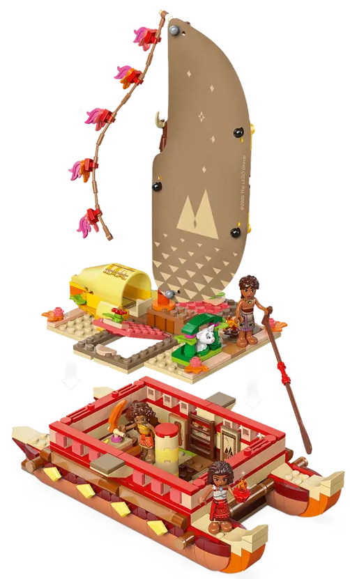 ✅ Zawiera łódź z dwoma kadłubami, materiałowym żaglem, odczepianym pokładem i kajutami pod pokładem, a także cztery postacie LEGO® ǀ Disney i mnóstwo akcesoriów