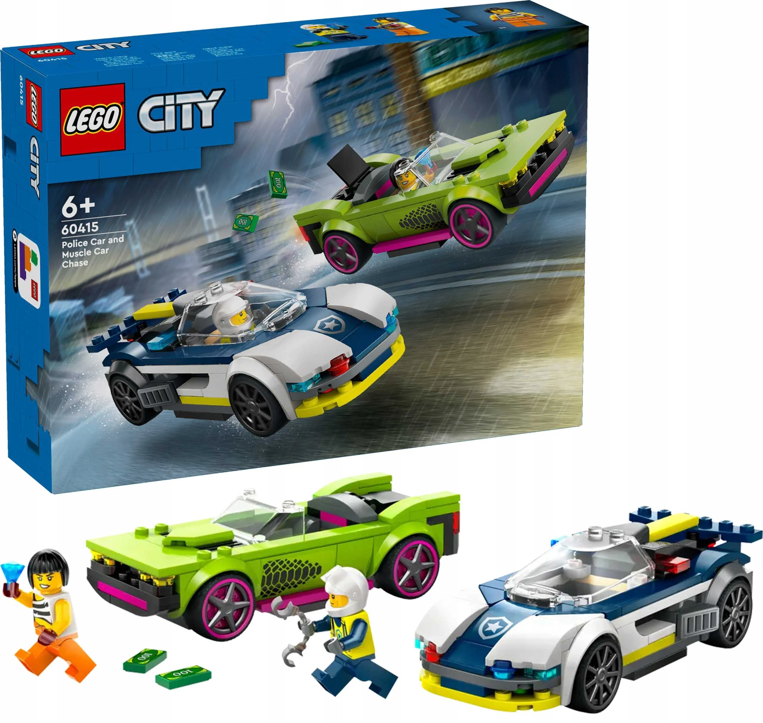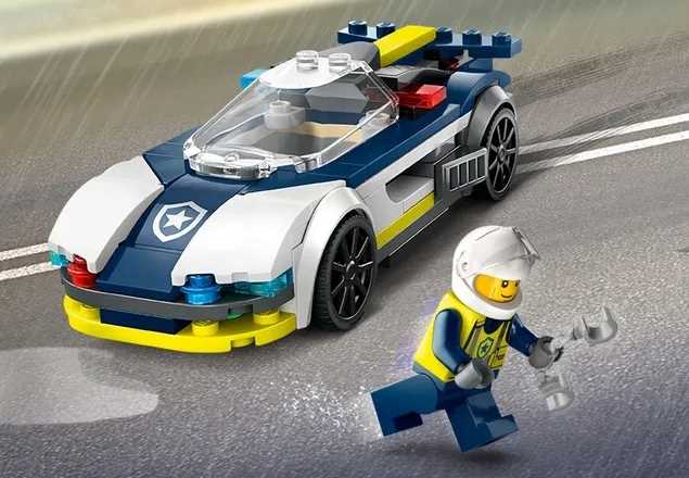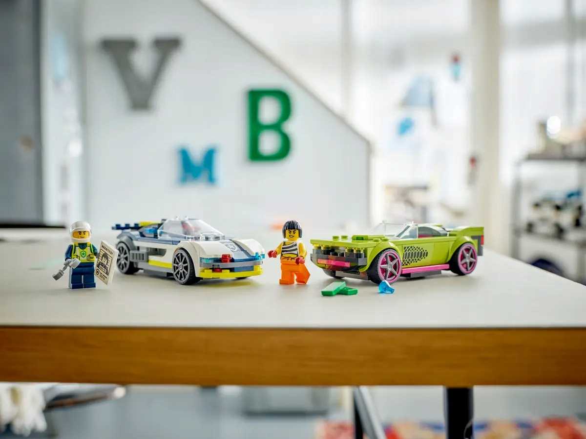 LEGO City, pościg, radiowóz, samochód policyjny, muscle car, zestaw klocków, zabawki LEGO, budowanie LEGO, zestaw do składania, minifigurki, policjant, złoczyńca, odgrywanie ról, zestaw dla dzieci, chłopcy, dziewczynki, kreatywna zabawa, scenariusze, historie, zestaw kolekcjonerski, prezent dla dzieci, samochód uciekiniera, aplikacja LEGO Builder, instrukcje budowania, wizualizacja 3D, LEGO Polska, zabawki edukacyjne, pościgi samochodowe, LEGO City zestaw, samochody sportowe, rozwijanie wyobraźni, LEGO dla dzieci, LEGO zestawy, model do składania, zabawa w policję i złodzieja, Lego City ruch drogowy, LEGO zestaw kreatywny, rozwój umiejętności manualnych, LEGO na prezent, nowoczesne zabawki, LEGO zestaw z samochodami, Lego dla dzieci 6+