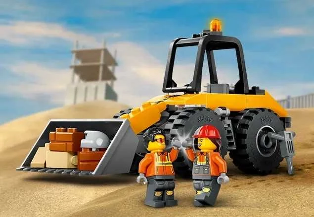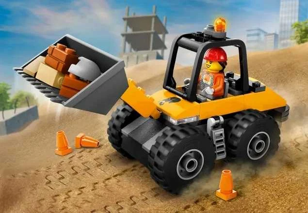 ➡️ Ta zabawka zawiera ładowarkę kołową do zbudowania, minifigurki kierowcy i pracownika, znak drogowy, pachołki i zabawkowy młot pneumatyczny