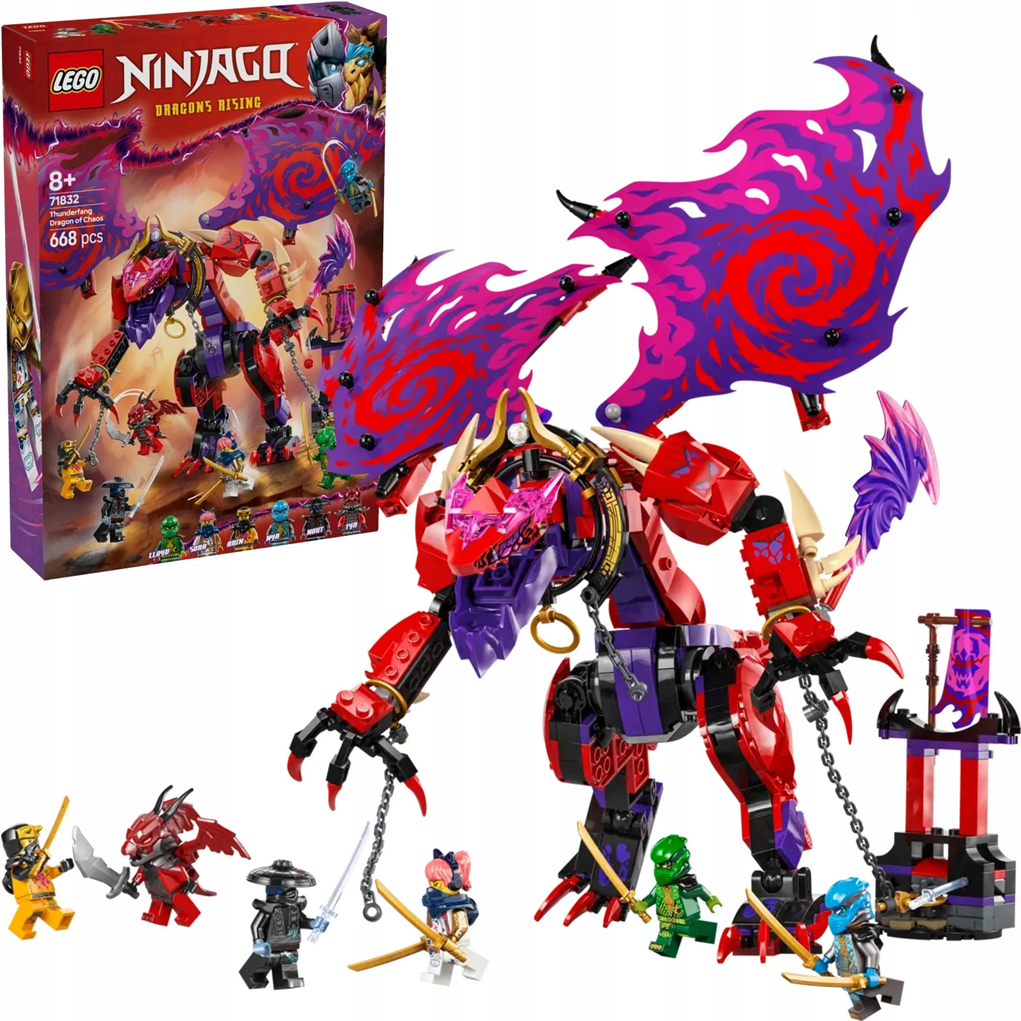 LEGO Ninjago, Smok chaosu Kiełogrzmot, zestaw LEGO NINJAGO, serial NINJAGO Powstanie Smoków, budowanie LEGO, zestaw konstrukcyjny, minifigurki NINJAGO, wojownicy ninja, Lloyd, Nya, Arin, Sora, złoczyńcy Nokt, przywódca Dragonów Tyr, miotacz klocków, ruchomy smok, pryzmatyczne miecze, bitwy LEGO, prezent urodzinowy, zabawa dla dzieci, zestawy z mechem, smok z ruchomymi elementami, świat LEGO Ninjago, kreatywna zabawa, LEGO dla chłopców, LEGO dla dziewczynek, uniwersum NINJAGO, przygody ninja, Aplikacja LEGO Builder, LEGO Polska Sp. z o. o., LEGO Warszawa, zabawka konstruktorska, certyfikaty CE FSC, klocki LEGO, zestaw ninja, odgrywanie scen, telewizyjny serial animowany, modele LEGO, bezpieczeństwo, fantazja i kreatywność, zabawki dla dzieci powyżej 8 lat, ruchome skrzydła, LEGO e-commerce, LEGO online store.