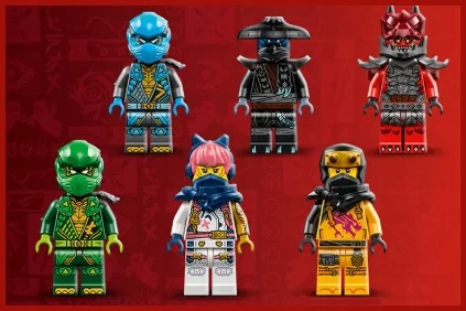 ✅ W tym zestawie LEGO znajduje się sześć minifigurek NINJAGO: wojownicy ninja Lloyd, Nya, Arin i Sora z bronią, a także złoczyńcy Nokt i przywódca Dragonów — Tyr, którzy również mają broń.