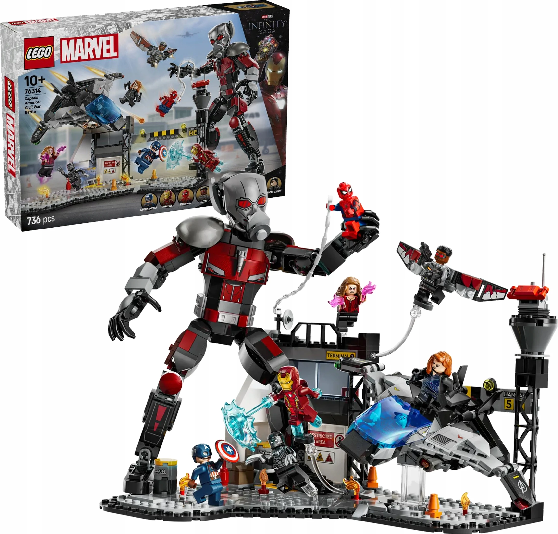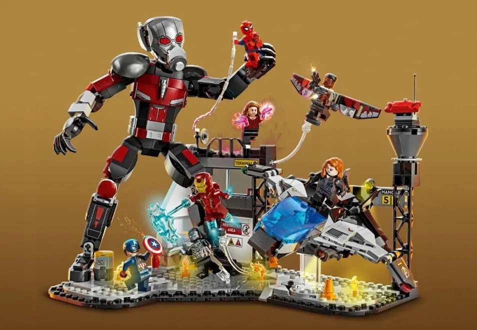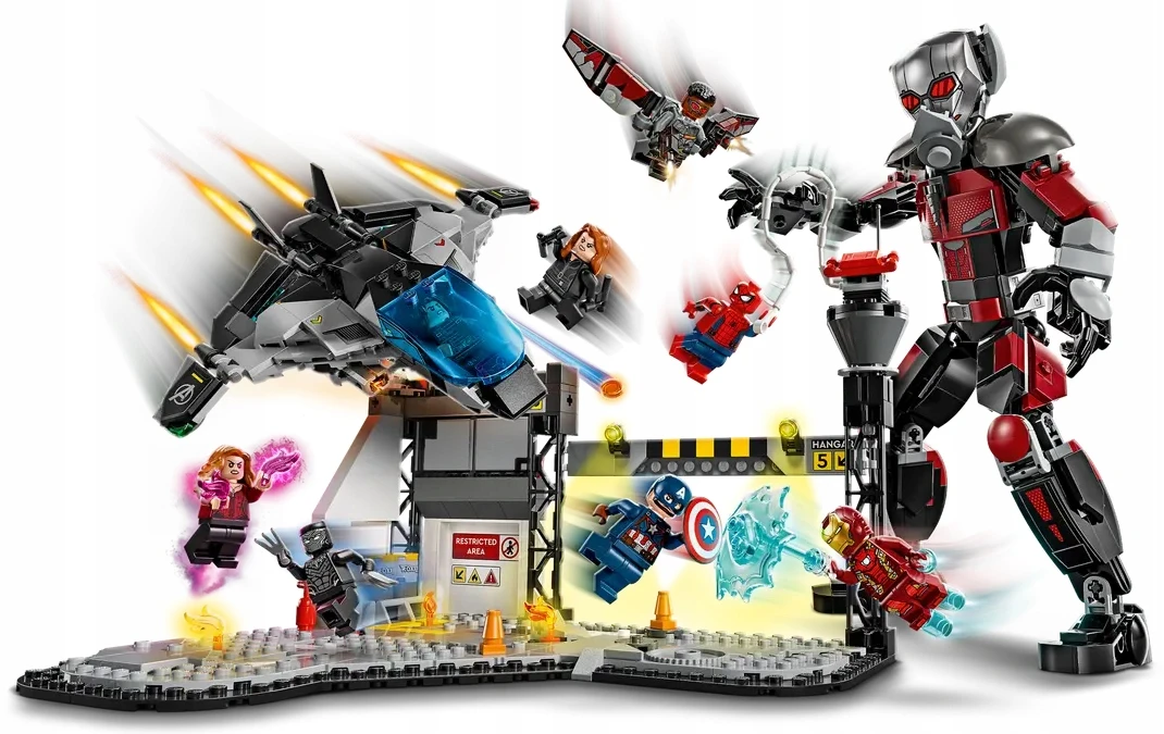 ✅ Ten zestaw jest oparty na scenie bitwy na lotnisku z filmu Kapitan Ameryka: Wojna bohaterów Marvel Studios.