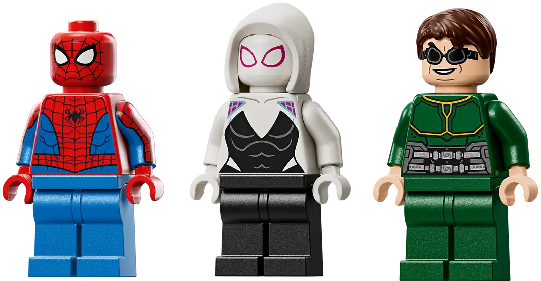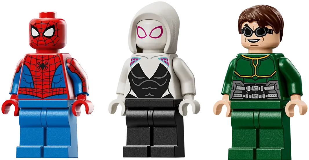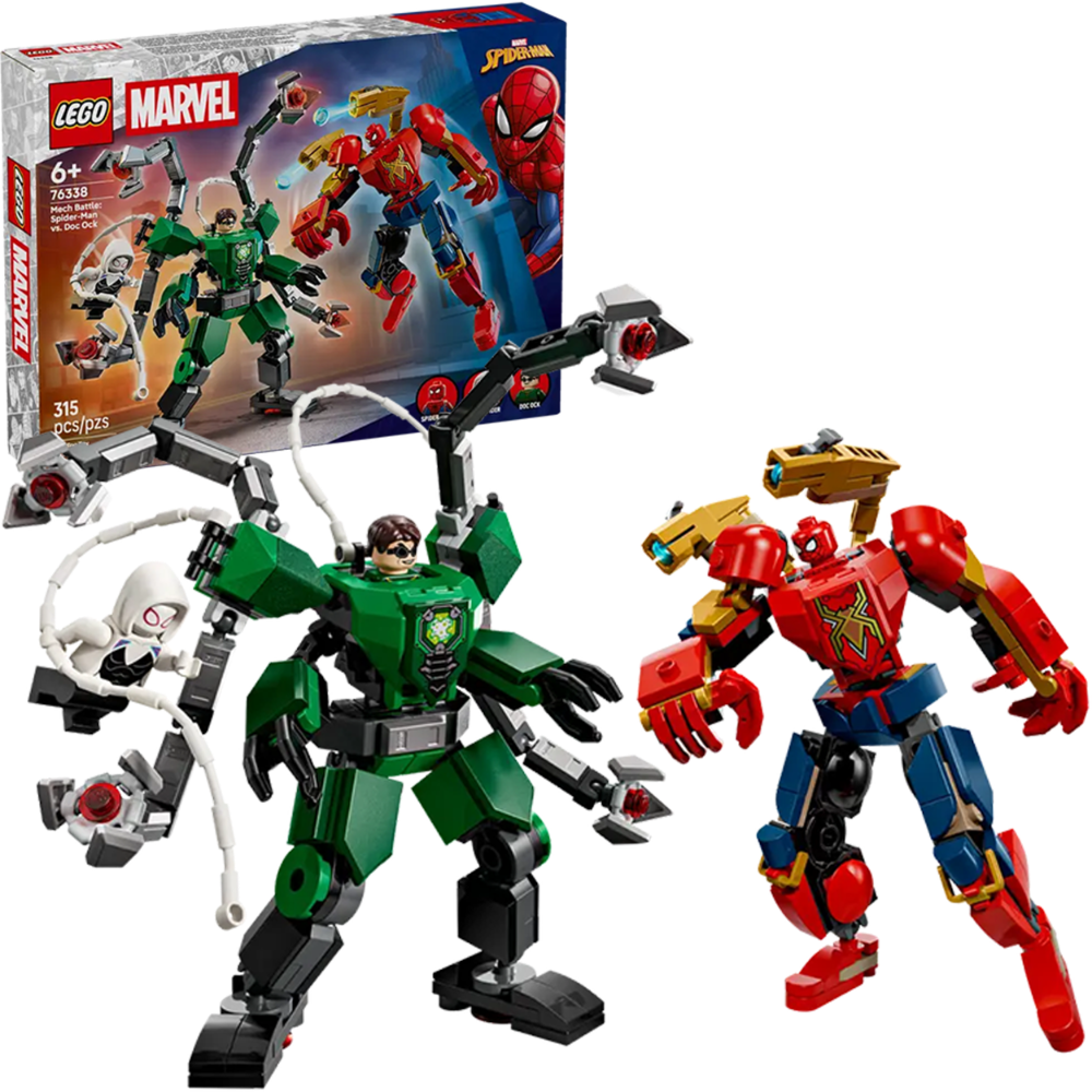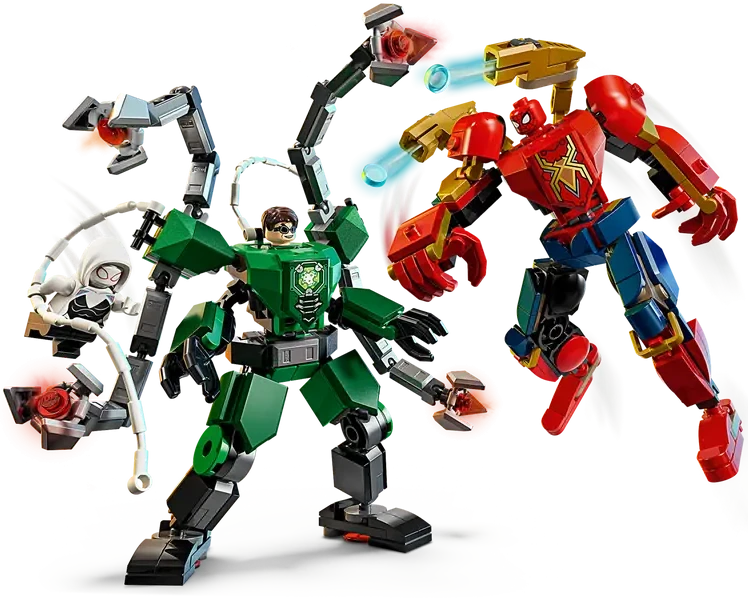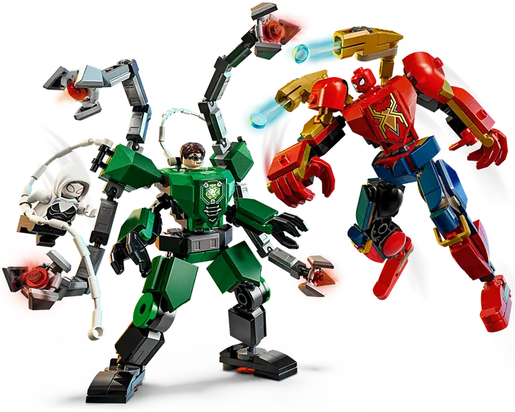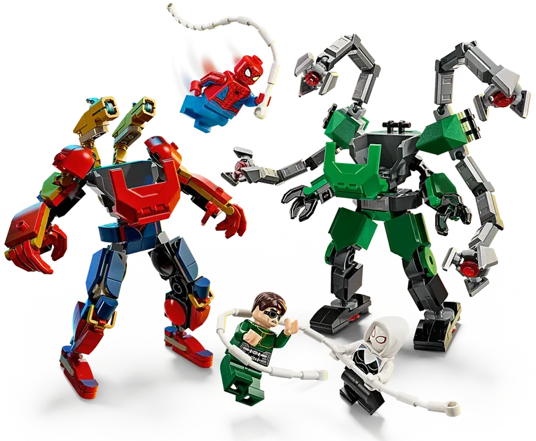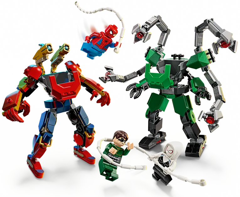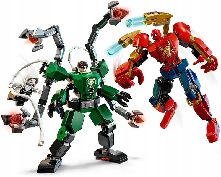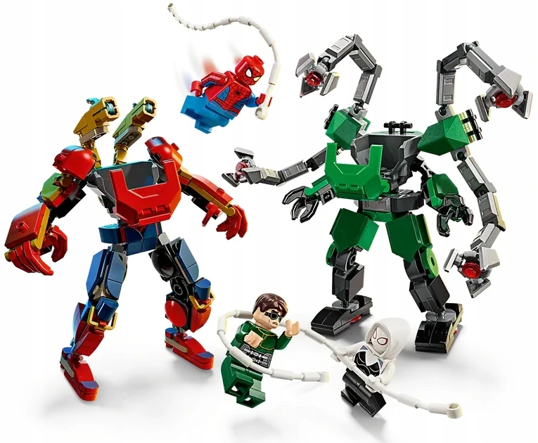✅ Dwa imponujące mechy: Spider-Mana i Doc Ocka z charakterystycznymi broniami i przypominającym pajęczak satelitą.