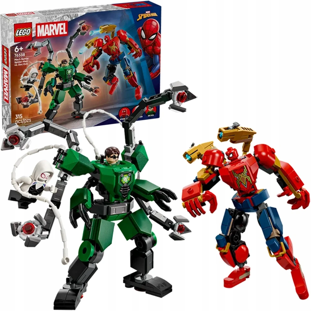 Poznaj niesamowitą bitwę mechów z zestawem LEGO Super Heroes 76338 – Spider-Man kontra Doc Ock! Ten dynamiczny zestaw zawiera dwa potężne mechy bojowe, każdy z unikalnymi zdolnościami i uzbrojeniem, oraz trzy figurki: Spider-Mana, Doktora Octopusa oraz wiernego pajęczaka-satelitę. Solidne detale, wymienne części i ruchome elementy pozwalają na odtwarzanie epickich pojedynków z komiksów i filmów. Idealny dla młodszych i starszych fanów superbohaterów – zestaw rozwija kreatywność i zdolności manualne.