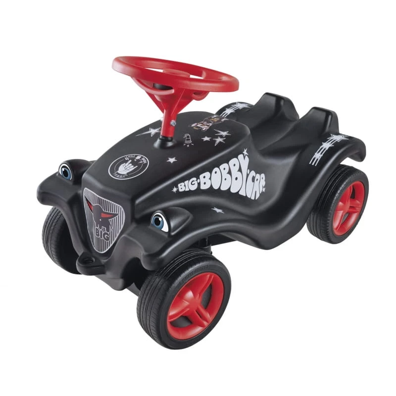 BIG Rock’N’Roll Jeździk Odpychacz Bobby Car Classic Ten solidny pojazd dla dzieci to prawdziwy hit wśród maluchów! Czarno-czerwona kolorystyka z kolorowymi naklejkami – struny gitary, gwiazdy, błyskawice i rockandrollowy pies – sprawia, że auto zachwyci zarówno dziewczynki, jak i chłopców.
