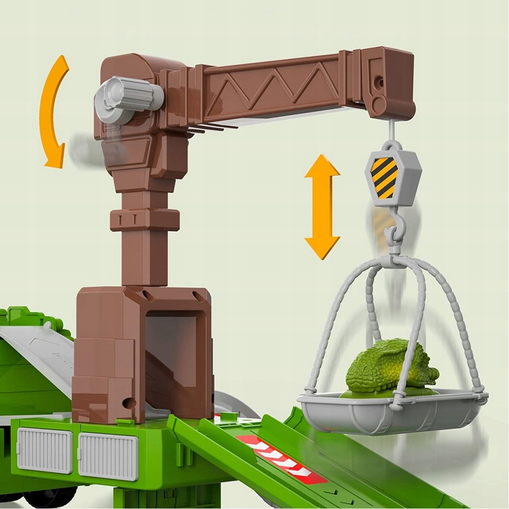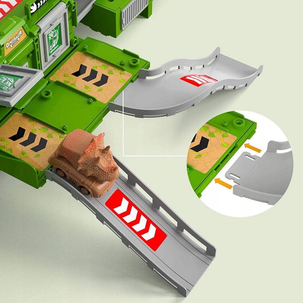 Ciężarówka dinozaur posiada otwieraną naczepę. Otwarta naczepa tworzy zjazd dla samochodzików i miejsce do montażu dźwigu. Zjazd zaczyna się na górze ciężarówki, dodatkowy podnoszony element jezdni pozwala nadać pęd samochodzikowi, który zjeżdża z samochodu pod dźwigiem i zjeżdża po kolejnej zjeżdżalni. Po obu stronach tira są miejsca do montażu czterech dodatkowych zjeżdżalni. Na środku samochodu są dwa pomieszczenia otwierane z obu stron, w których można schować dwa małe samochodziki.