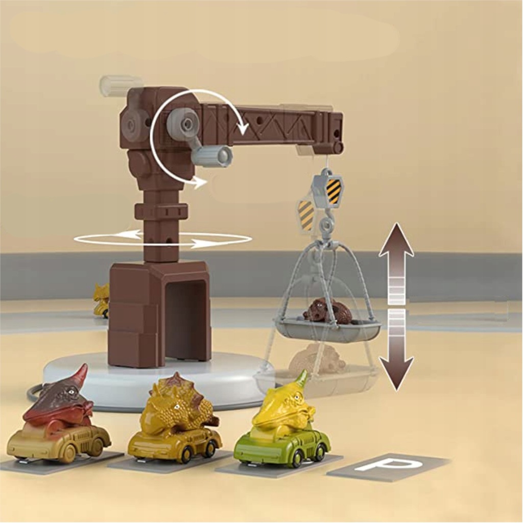 Dźwig posiada platformę dzięki, której można podnosić i opuszczać samochodziki. Dźwig działa manualnie poprzez kręcenie korbką.