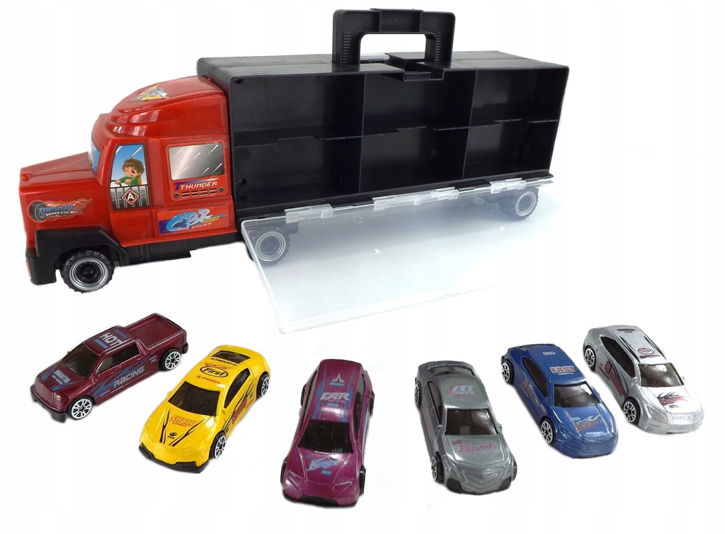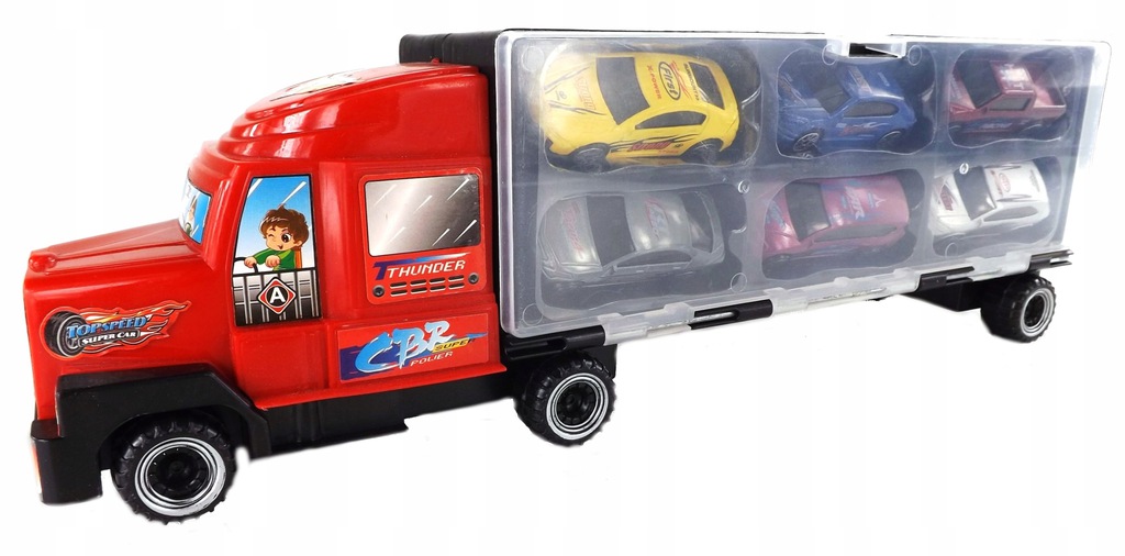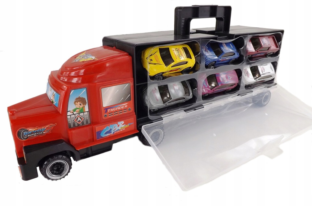 Ciężarówka laweta będzie idealną zabawką dla Twojej pociechy. Ciężarówka posiada otwieraną naczepę w której można schować małe samochody.