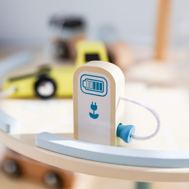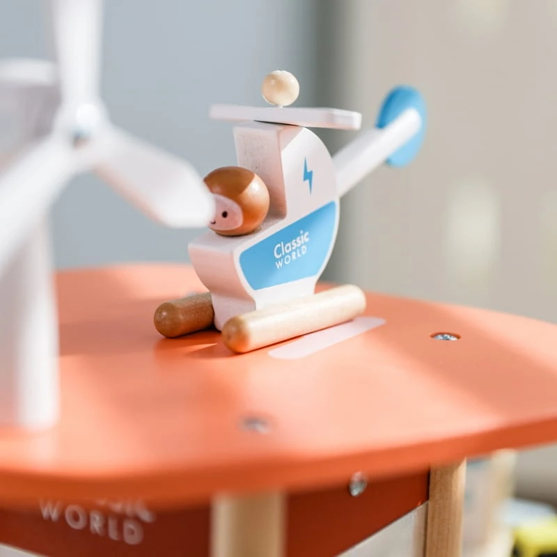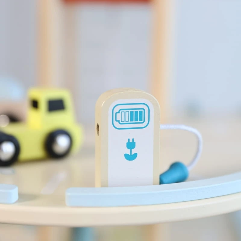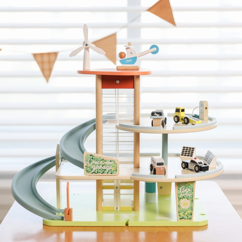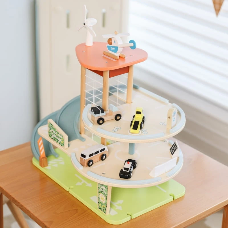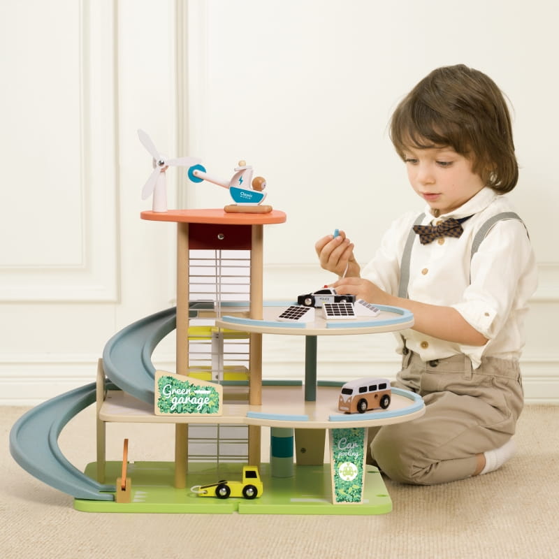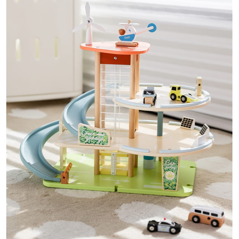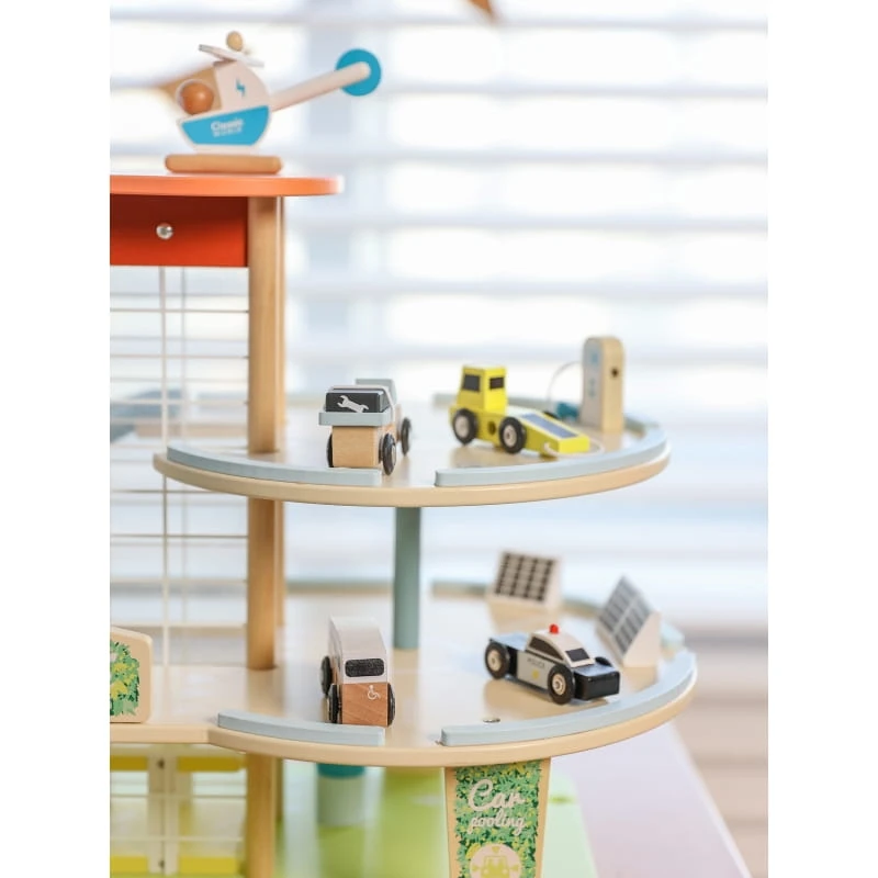 Drewniany wielopoziomowy parking od marki Classic World ze stacją ładowania pojazdów elektrycznych, windą, panelami fotowoltaicznymi, wiatrakiem oraz lądowiskiem dla helikoptera rozbudzi wyobraźnię każdego fana samochodów oraz motoryzacji. Aby pojazd mógł dostać się na parking lub z niego wyjechać należy podnieść szlaban. Dzięki windzie (która porusza się ręcznie) pojazdy mogą przemieszczać się pomiędzy piętrami. Szybki zjazd samochodów z poszczególnych poziomów umożliwia specjalny, kręty zjazd. Garaż wyposażony jest także w stację ładowania pojazdów elektrycznych. Ponadto w zestawie znajdują się 3 samochodziki oraz helikopter.