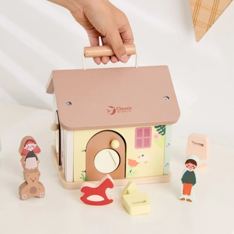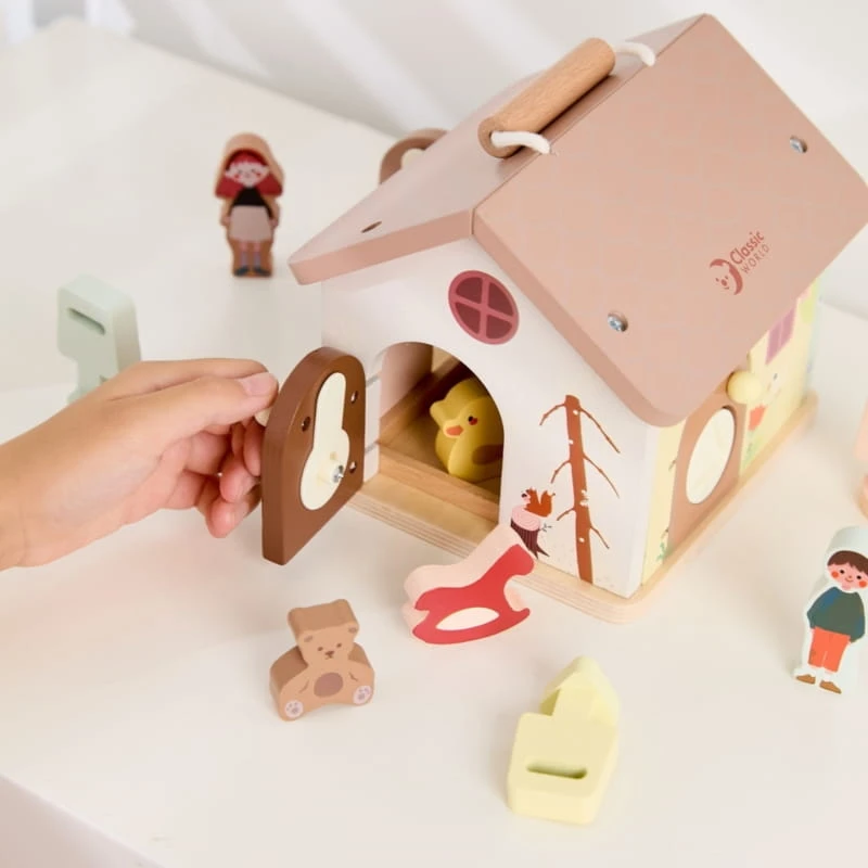 CLASSIC WORLD Drewniany Domek Sensoryczny Edukacyjny z Zamkami Kluczykami 11el.