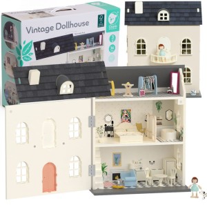 Uroczy domek dla lalek w stylu vintage od marki CLASSIC WORLD, który zachwyci każde dziecko! Ten fantastyczny, 3-piętrowy domek jest pięknie udekorowany różnorodnymi meblami. Domek można otworzyć przez dach, co zapewnia lepszy dostęp do różnych pomieszczeń. W skład wyposażenia wchodzą akcesoria do dekoracji wnętrza, takie jak łóżko z narzutą, wanna, sofa, lampa, stół, dwa krzesła, kuchnia i lodówka.