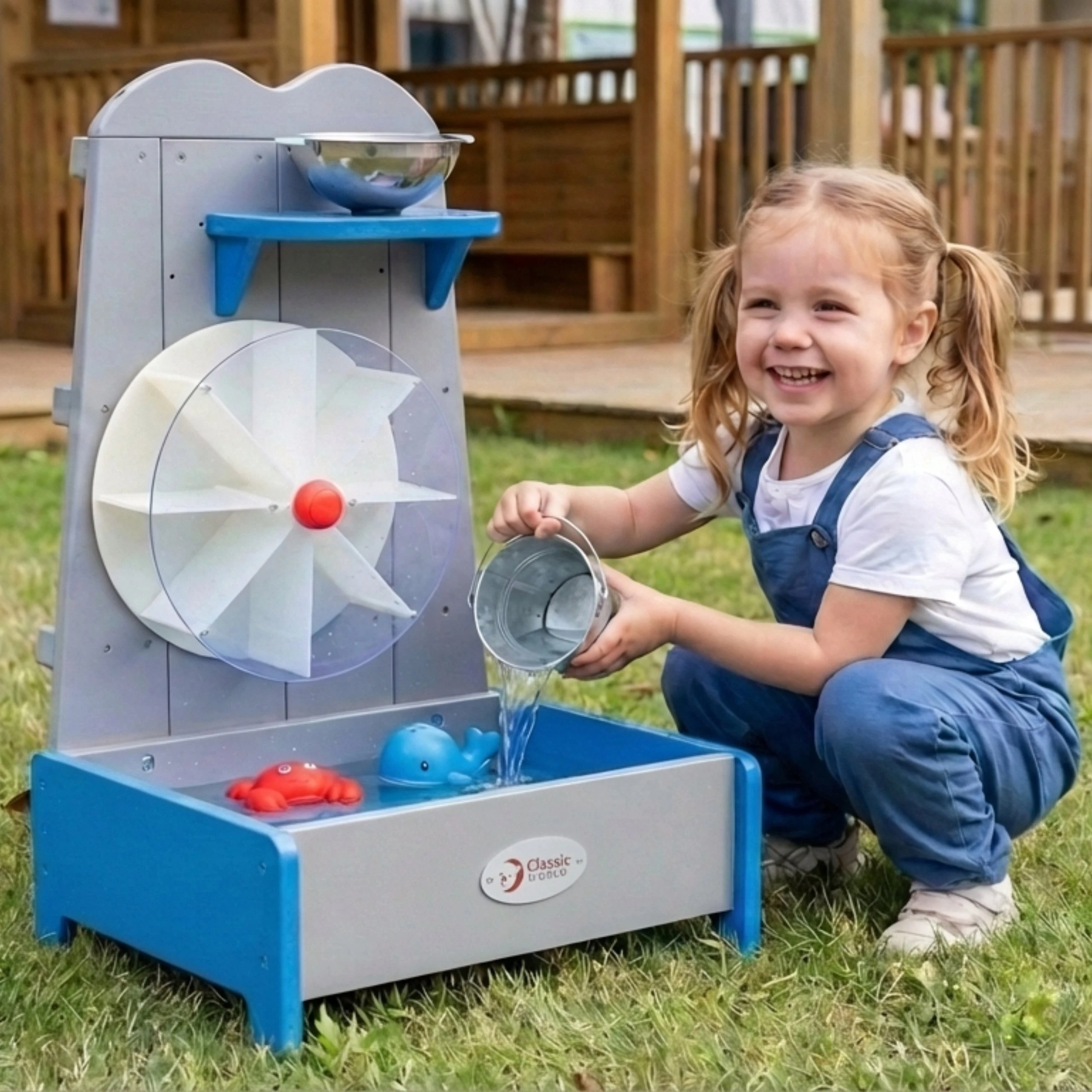 Drewniane koło wodne od renomowanej marki Classic World to wspaniała propozycja na urozmaicenie zabawy na świeżym powietrzu. Ta edukacyjna zabawka wprowadza dzieci w świat fizyki, energii wodnej i mechaniki w prosty i angażujący sposób. Konstrukcja składa się z metalowego lejka umieszczonego na szczycie, przez który wlewa się wodę. Strumień cieczy opada na łopatki wirnika, wprawiając duże koło w ruch obrotowy. Całość zabezpieczona jest przeźroczystą osłoną, co pozwala bezpiecznie obserwować proces, a woda gromadzi się w dolnym zbiorniku, gotowa do ponownego użycia.