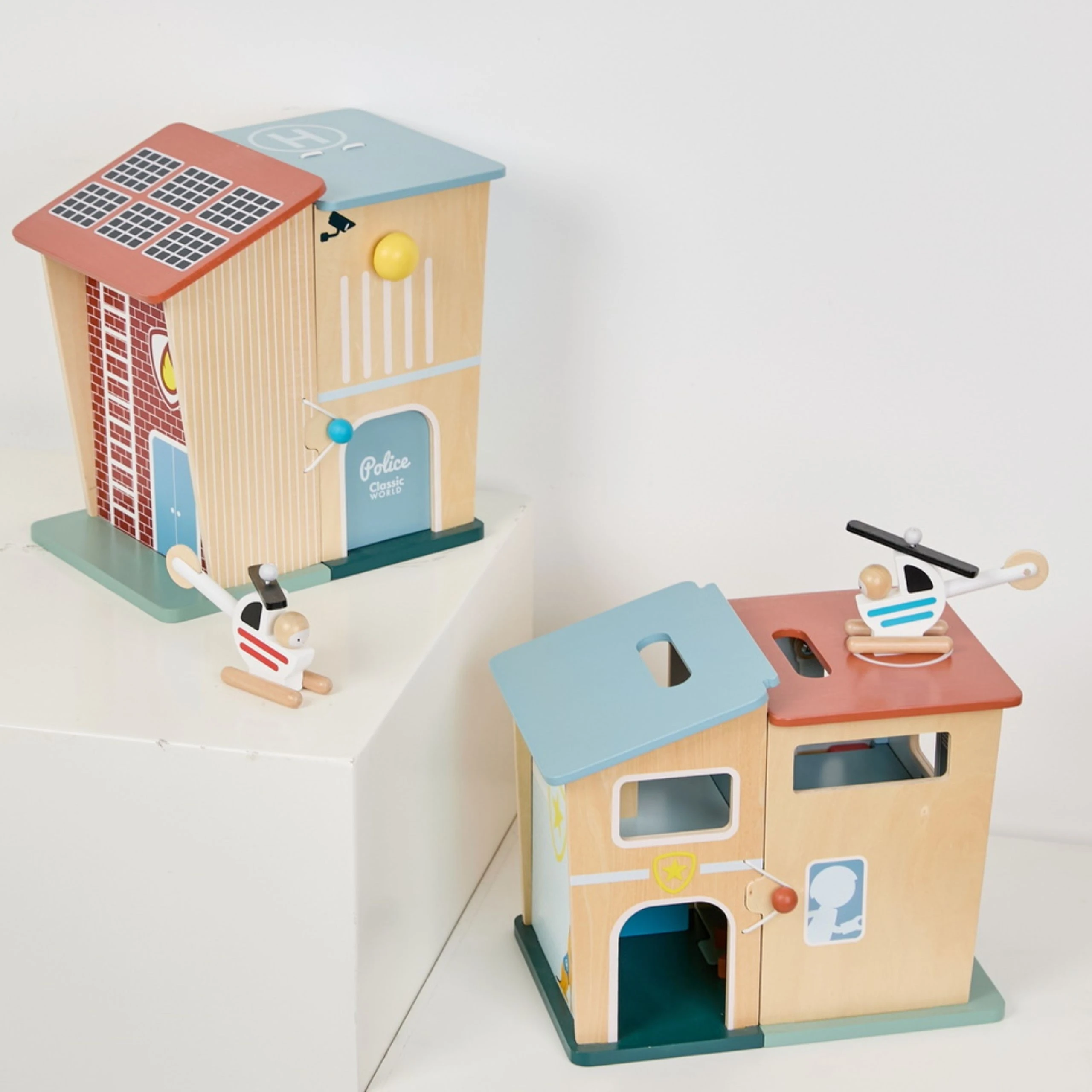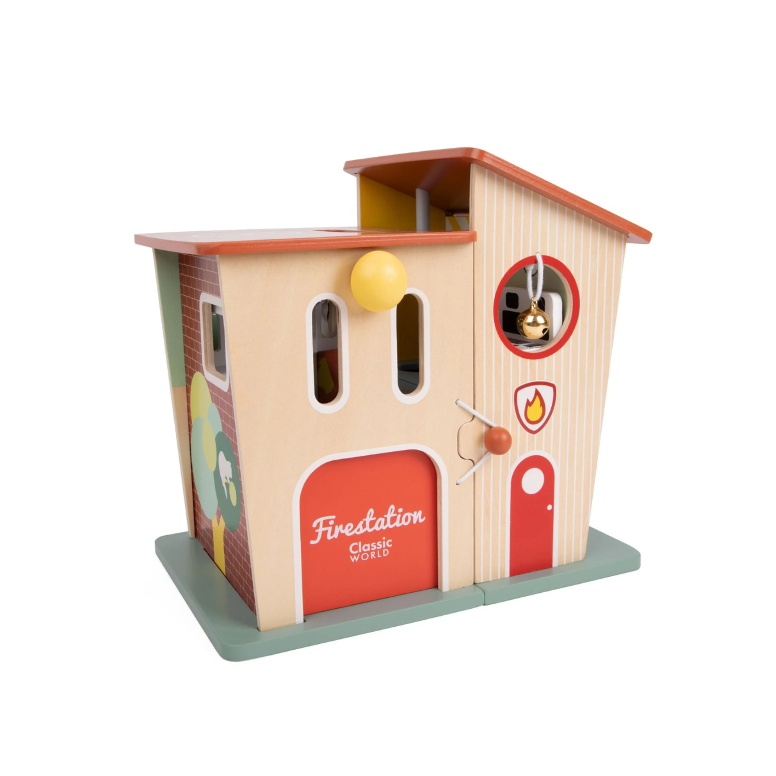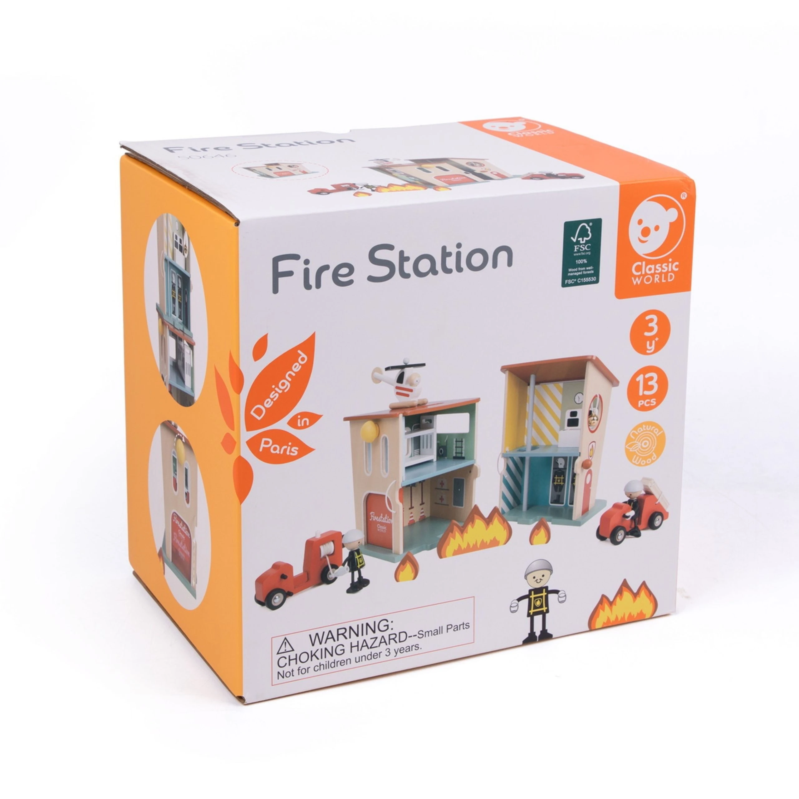 CLASSIC WORLD Remiza Strażacka Drewniana Garaż Auto Helikopter Figurki 13el.