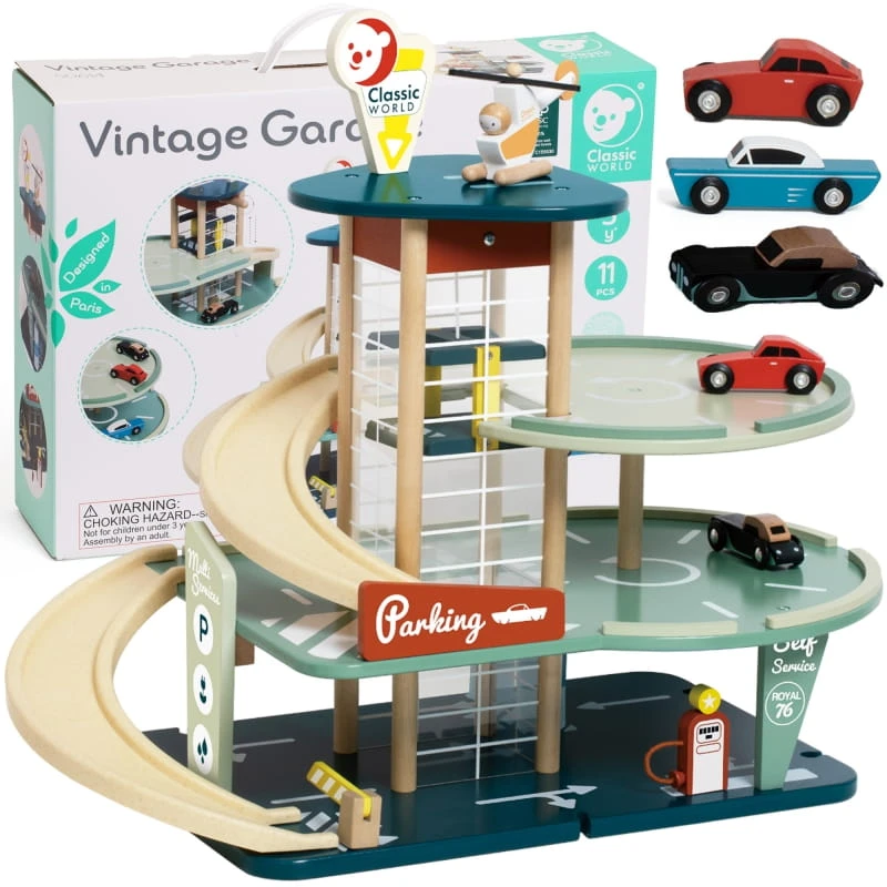 Zainspirowany latami 50-tymi, ten garaż od marki CLASSIC WORLD przypomina złotą erę samochodów! Zabawka oferuje stylowe samochody, myjnię samochodową, dystrybutor paliwa i rampy bioplastowe umożliwiające dojazd na parking. Winda obsługuje wszystkie 3 poziomy i jest zwieńczona platformą, na której znajduje się helikopter. Podstawa wyposażona jest w przyłącza umożliwiające utworzenie toru. Zabawka rozwija umiejętności motoryczne oraz językowe. Zabawa z innymi dziećmi pomaga również w rozwijaniu umiejętności społecznych. Drewno posiada certyfikat FSC, a rampy wykonane są z bioplastiku.