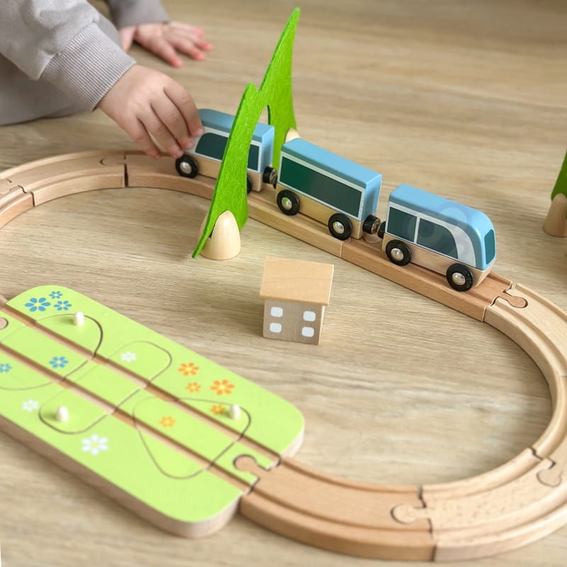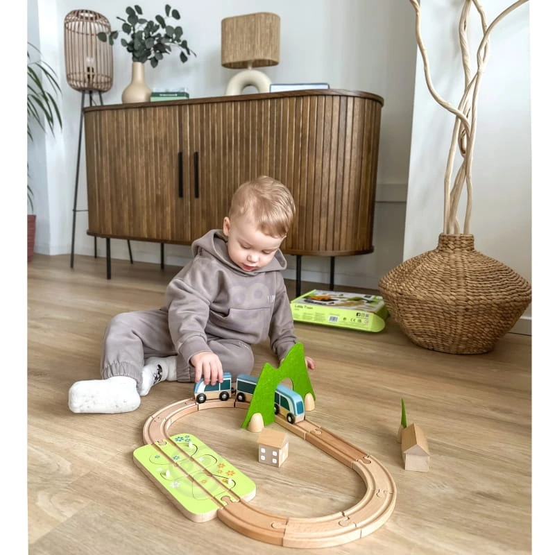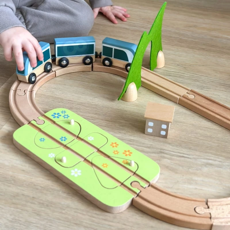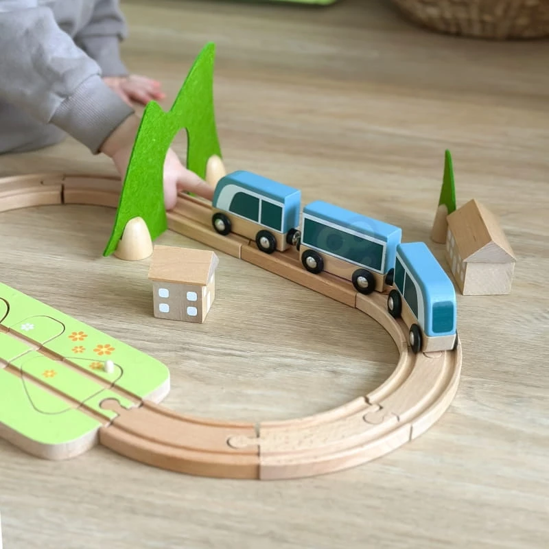 Zestaw kolejka drewniana pociąg od marki CLASSIC WORLD to prawdziwa piękność, a jego atrakcje i filcowe dekoracje pełne są niespodzianek! W zestawie znajdują się tunel, stacja i puzzle z kształtami, które można połączyć, aby odbudować trasę. Kolorowe kwiaty i ukryte zwierzęta pomagają w znalezieniu odpowiednich kształtów. Bloki można układać w stosy, tworząc domy, które można ustawić wokół toru. Pociąg ten stymuluje kreatywność, rozwój języka, małą motorykę i koordynację. Drewno posiada certyfikat FSC, a filc wykonany jest z materiału P.E.T. pochodzącego z recyklingu.