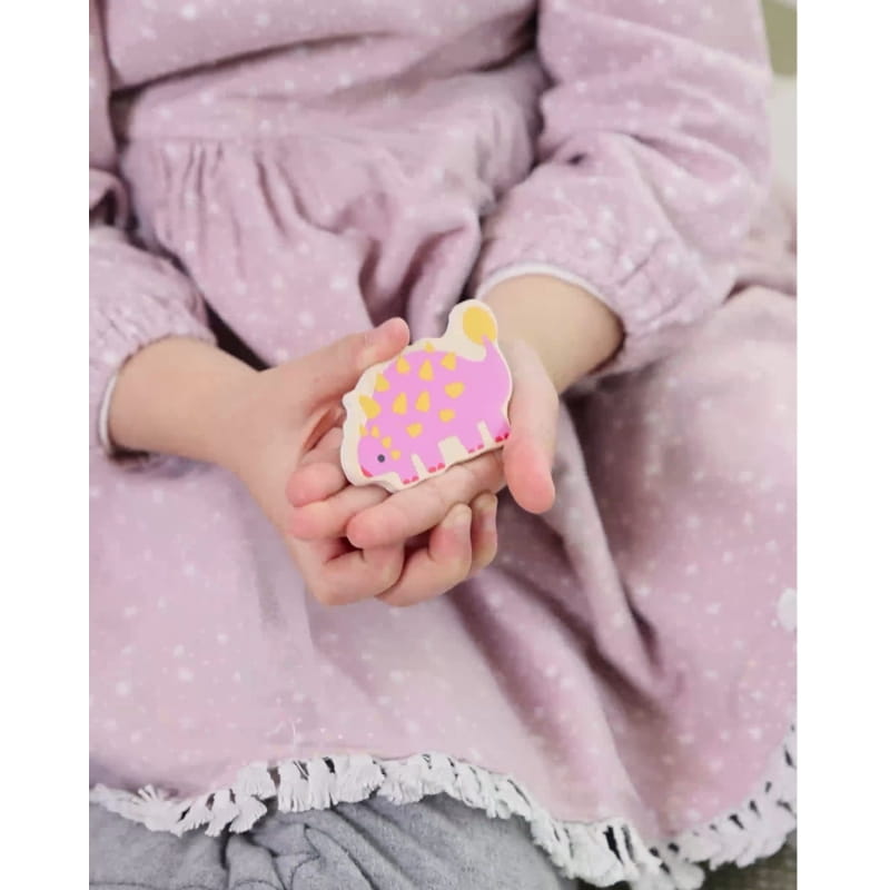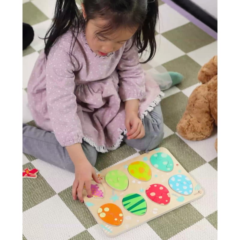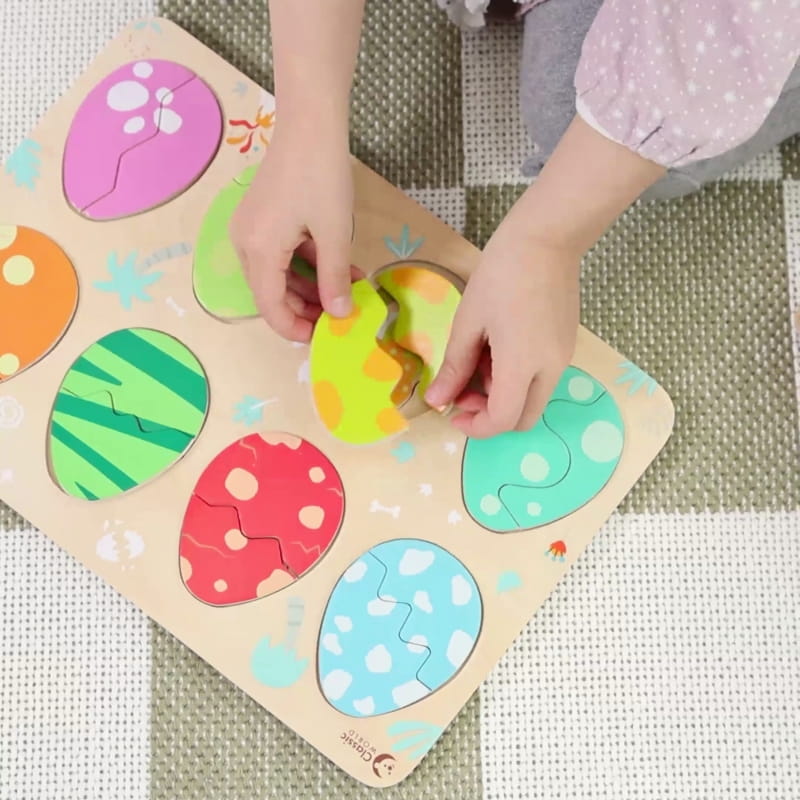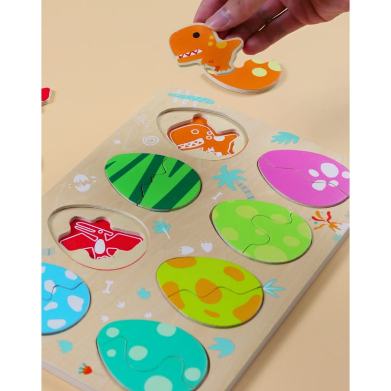 Trójwarstwowa konstrukcja pozwala dopasowywać jajka do ukrytych pod nimi dinozaurów, a na najniższej warstwie odkrywać proste rysunki pomagające w dopasowywaniu dinozaurów do opowiadających im miejsc. Zabawka wspiera naukę kształtów i kolorów, logiczne myślenie i kreatywność w przyjemny sposób.