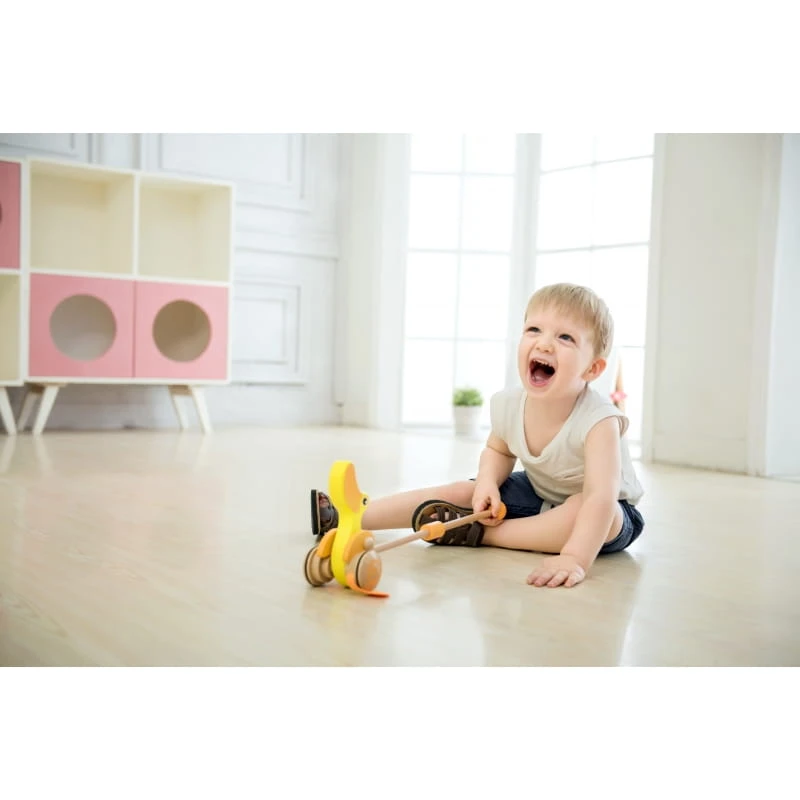 Drewniana zabawka do pchania marki Classic World. Dzieci mogą ćwiczyć chodzenie, prowadząc przed sobą ulubioną zabawkę. Podczas jeżdżenia, kaczuszka klapie płetwami, powodując u maluszka śmiech i radość. Kaczuszka to bestsellerowa zabawka marki Classic World.