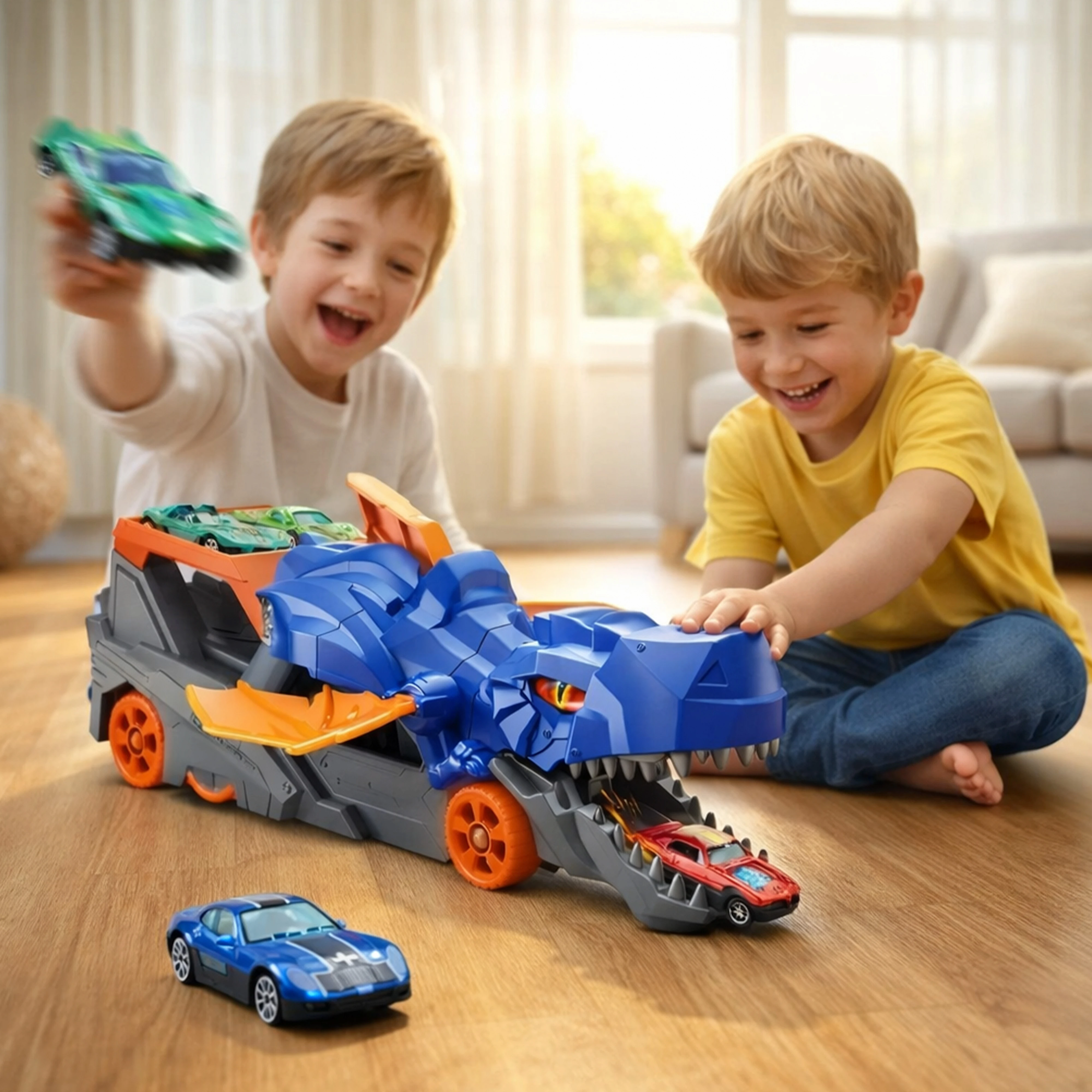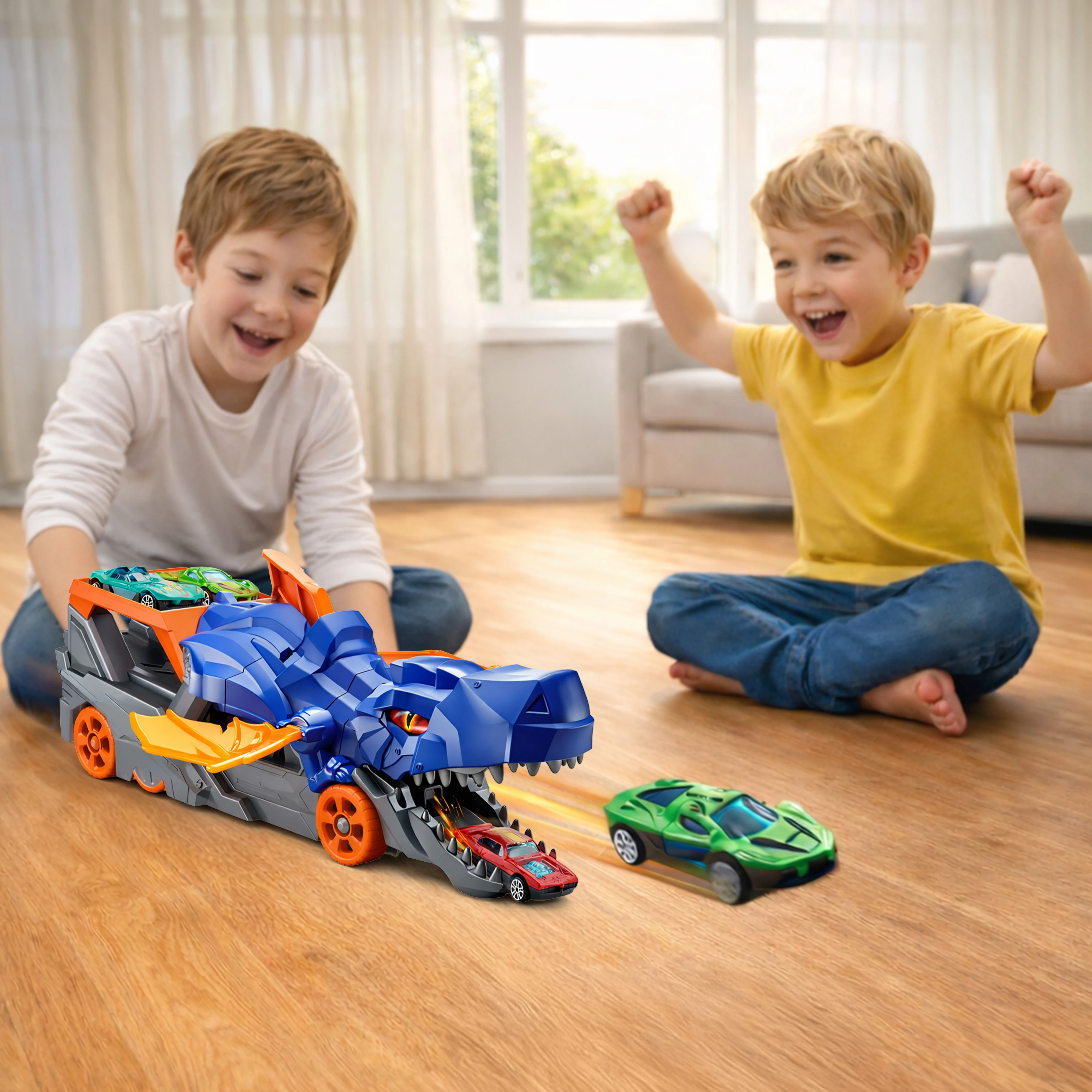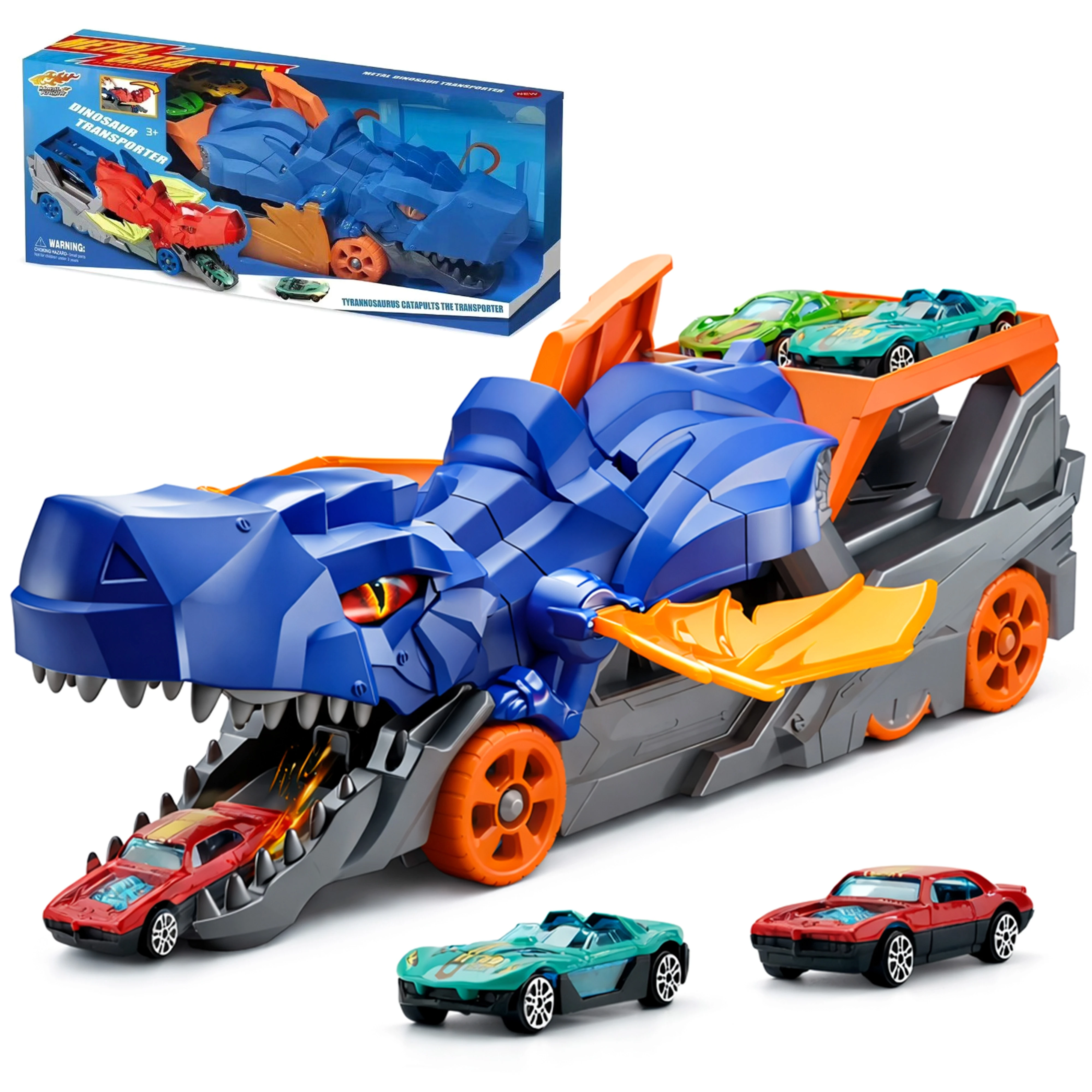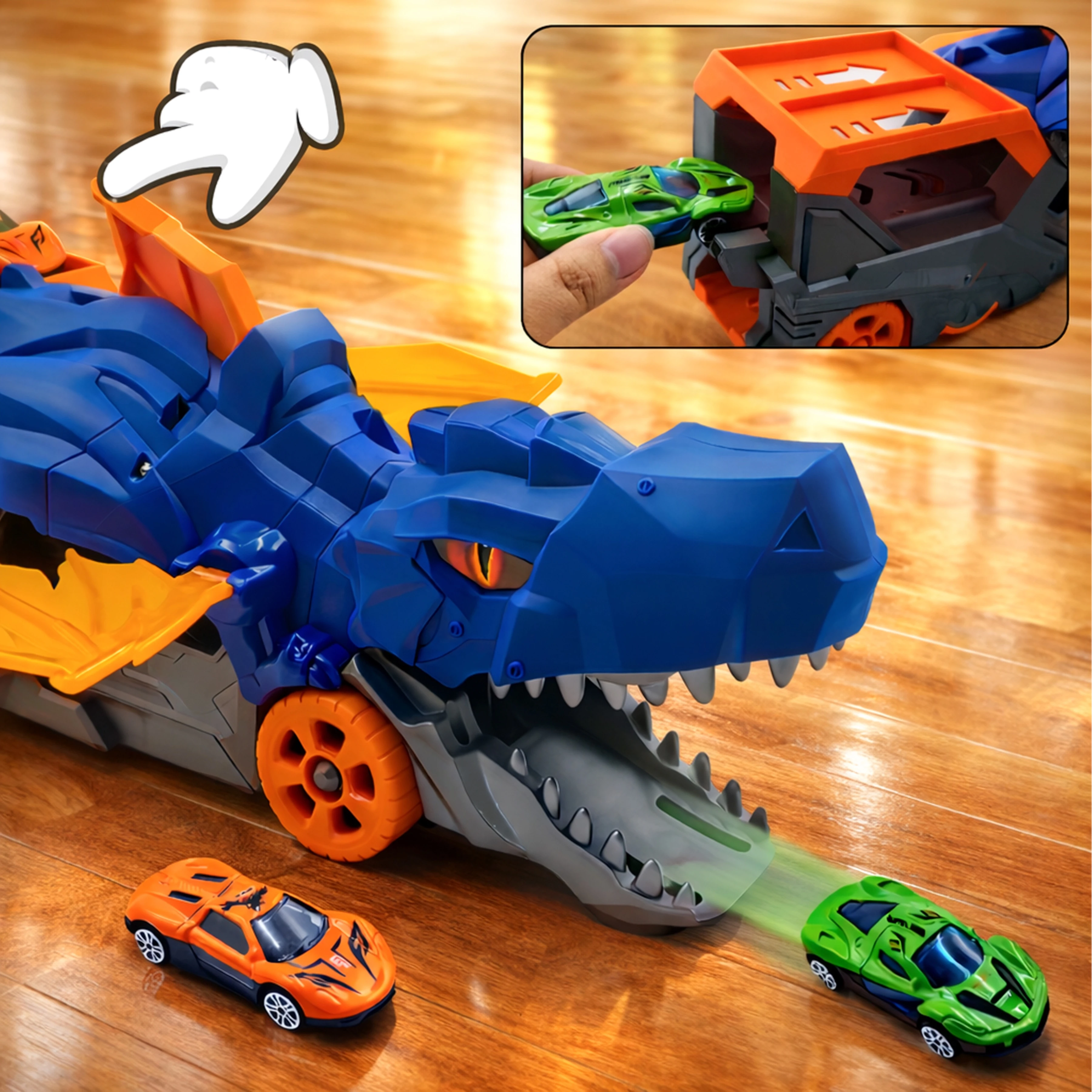 Interaktywny transporter Metal Knight to propozycja dla dzieci powyżej 3. roku życia, które kochają akcję. Niebieski tyranozaur pełni funkcję mobilnej bazy dla mniejszych pojazdów. Unikalną cechą zabawki jest wbudowana wyrzutnia – wystarczy załadować autko od tyłu, a wyleci ono z dużą prędkością wprost przez otwartą paszczę dinozaura.