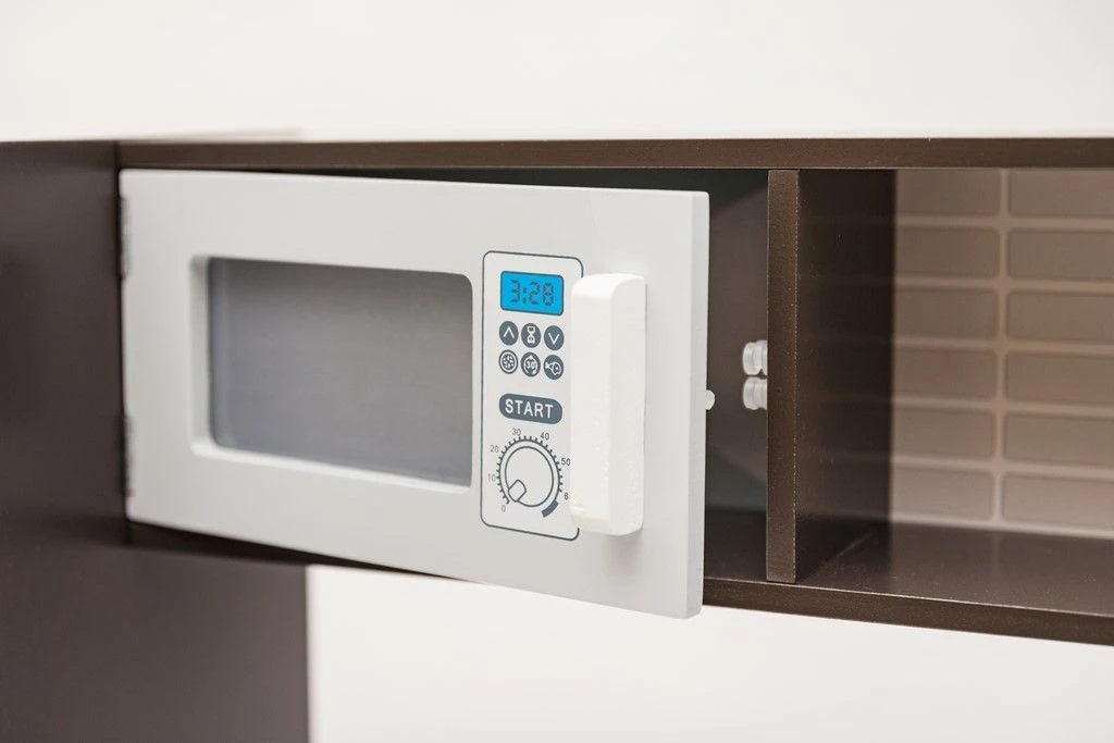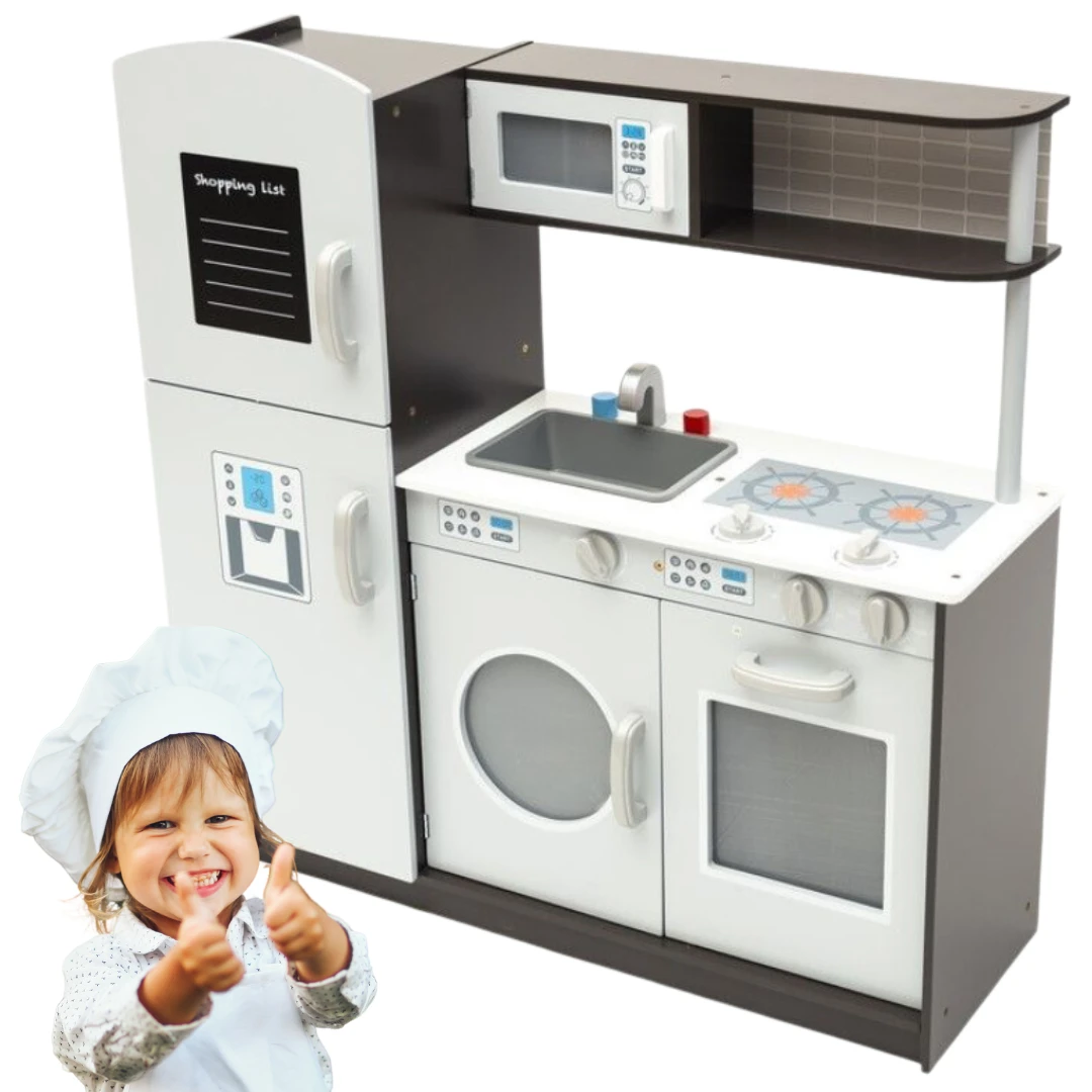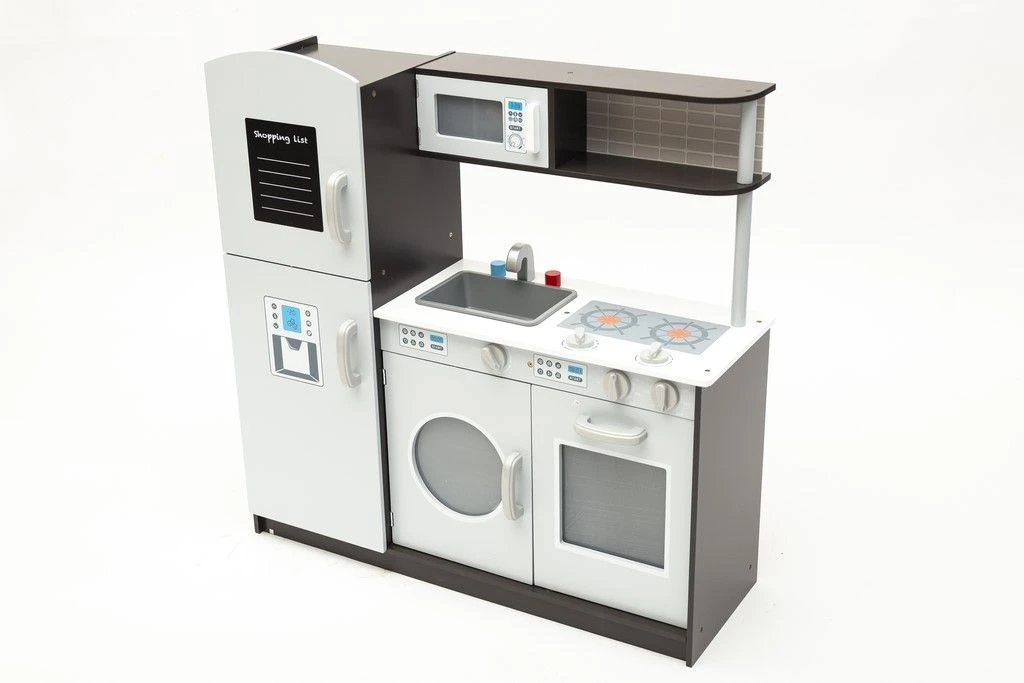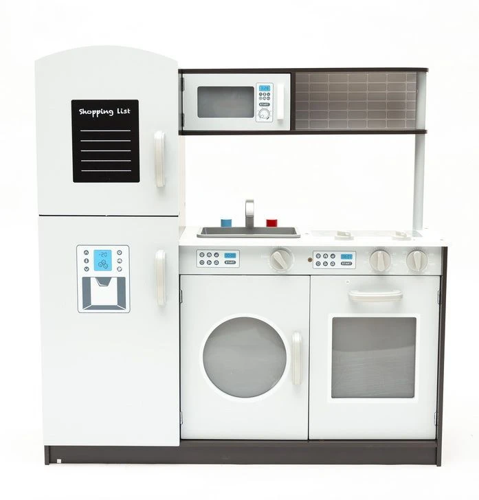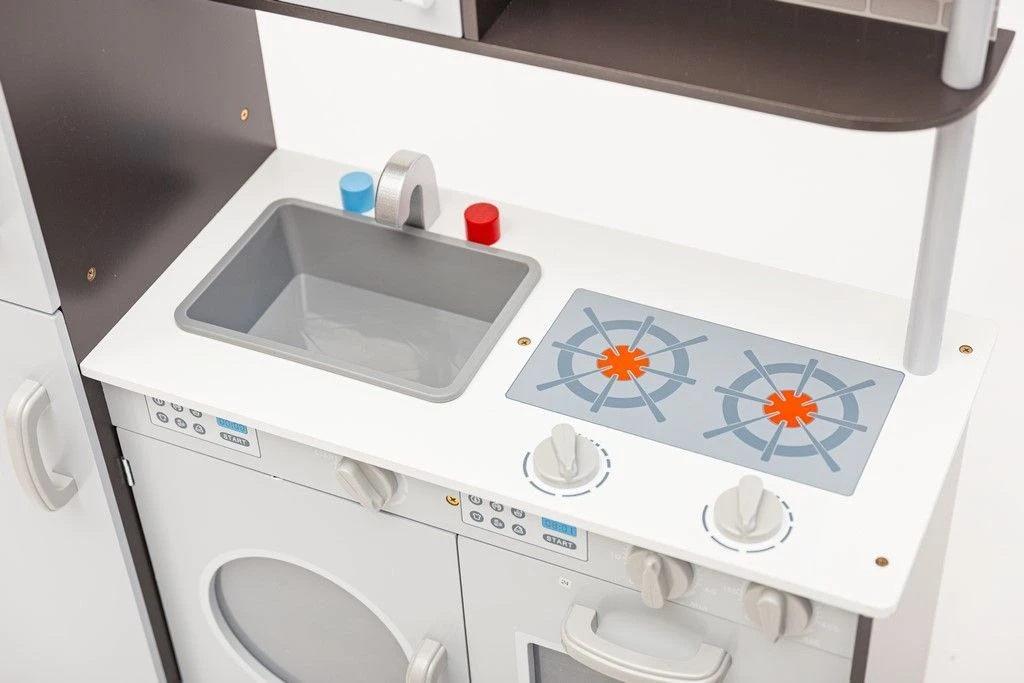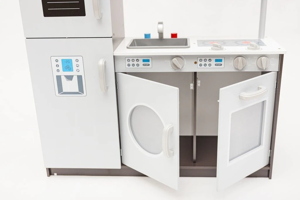 Dodatkową atrakcją są ruchome pokrętła płyty grzewczej, piekarnika oraz pralki. Na drzwiczkach lodówki znajduje się tablica, na której (przy pomocy kredy) mały kucharz z łatwością stworzy swoją listę zakupów.