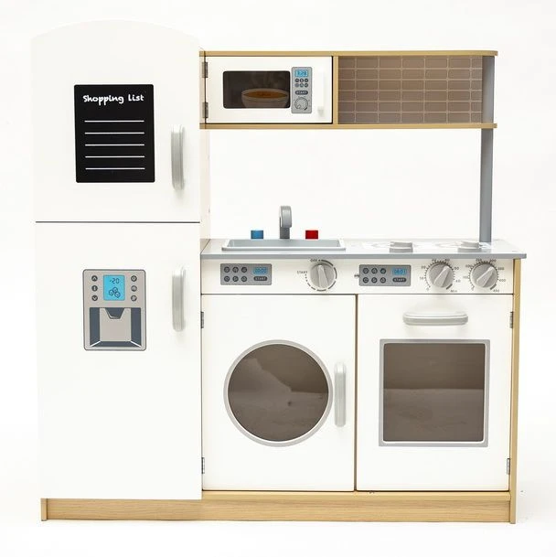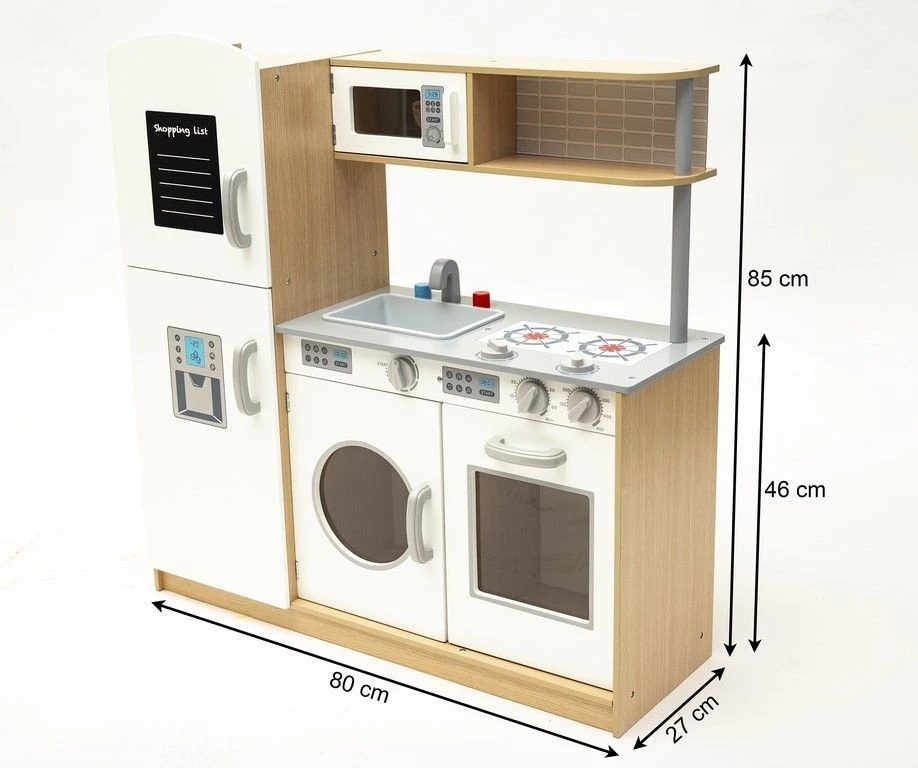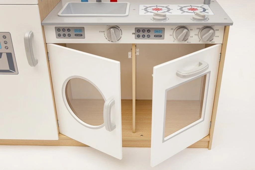 Dodatkową atrakcją są ruchome pokrętła płyty grzewczej, piekarnika oraz pralki. Na drzwiczkach lodówki znajduje się tablica, na której (przy pomocy kredy) mały kucharz z łatwością stworzy swoją listę zakupów.