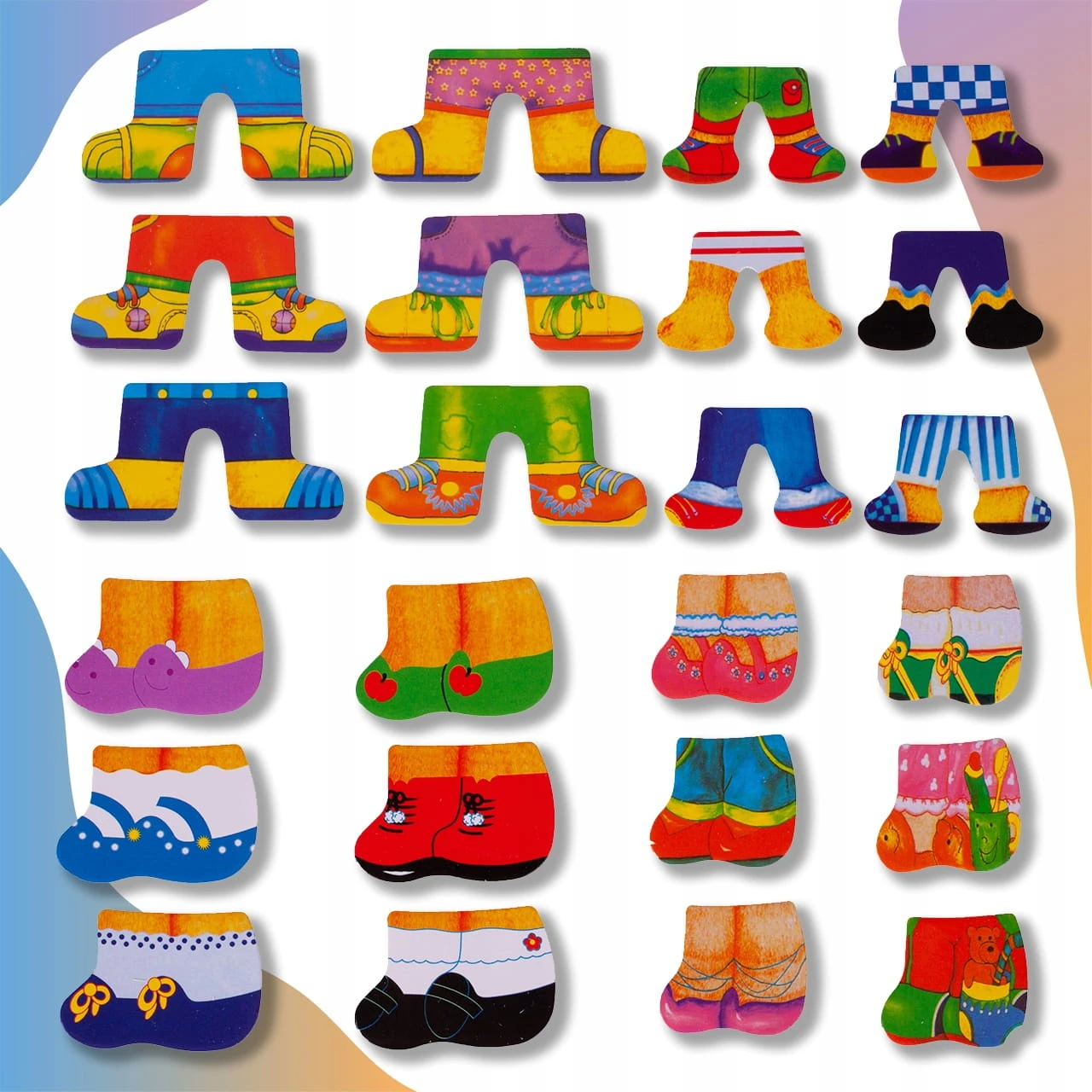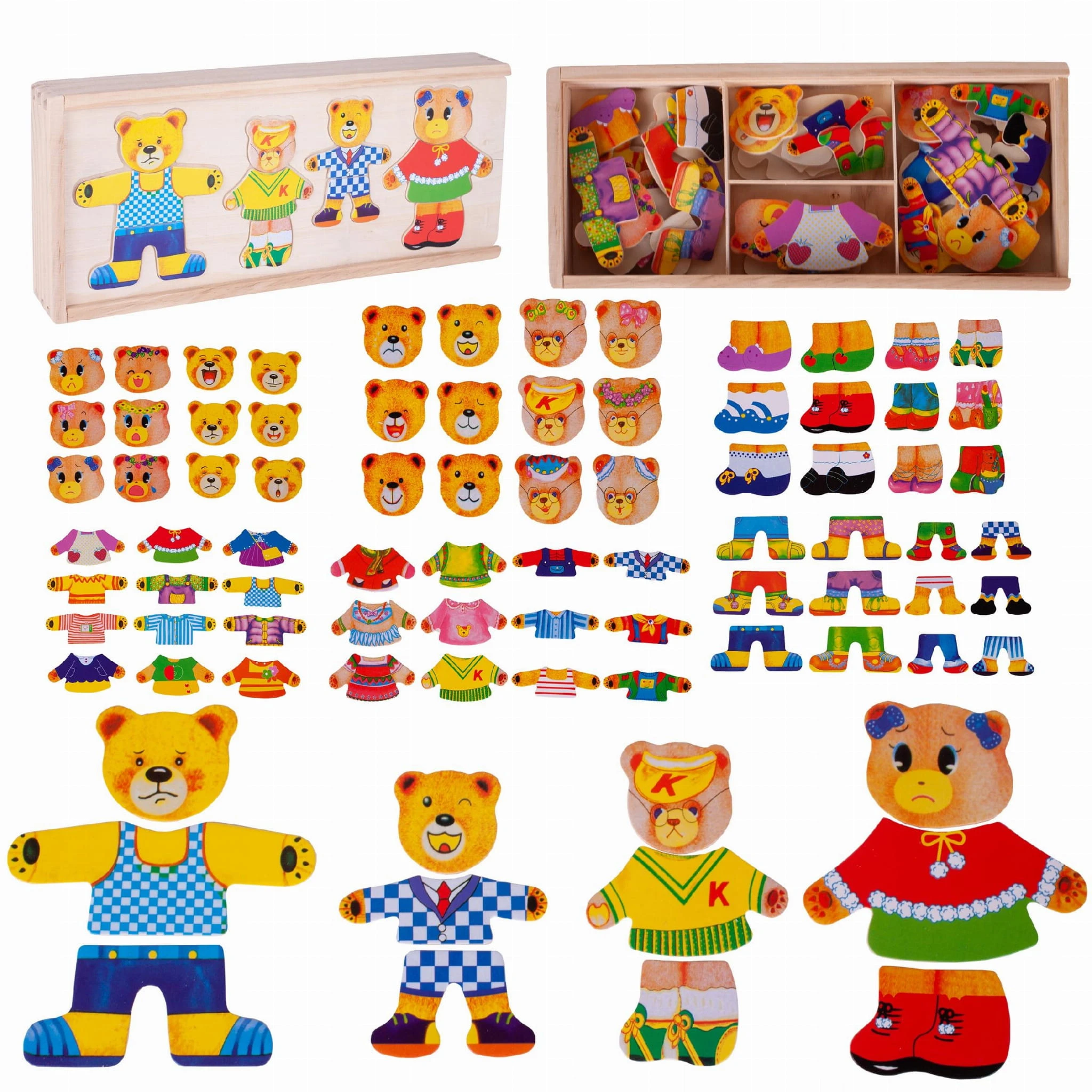 Dziecko dopasowuje główki (różne emocje), bluzki/sukienki oraz spodenki/buty, tworząc setki kombinacji. Drewniany wzornik–wieczko ma wyżłobienia na 4 misie, co ułatwia układanie i zachęca do opowiadania historyjek – także o emocjach.