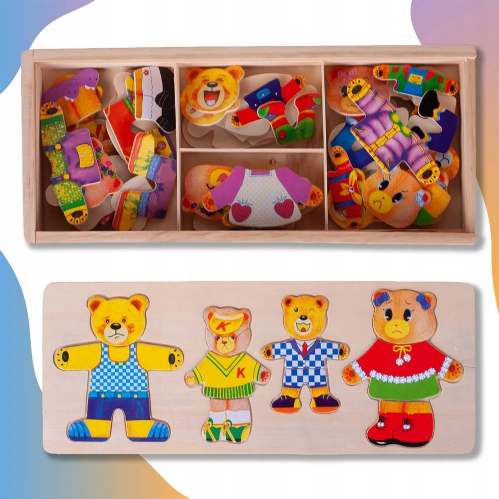 Drewniana układanka misie skrzynka klocki 74 el puzzle