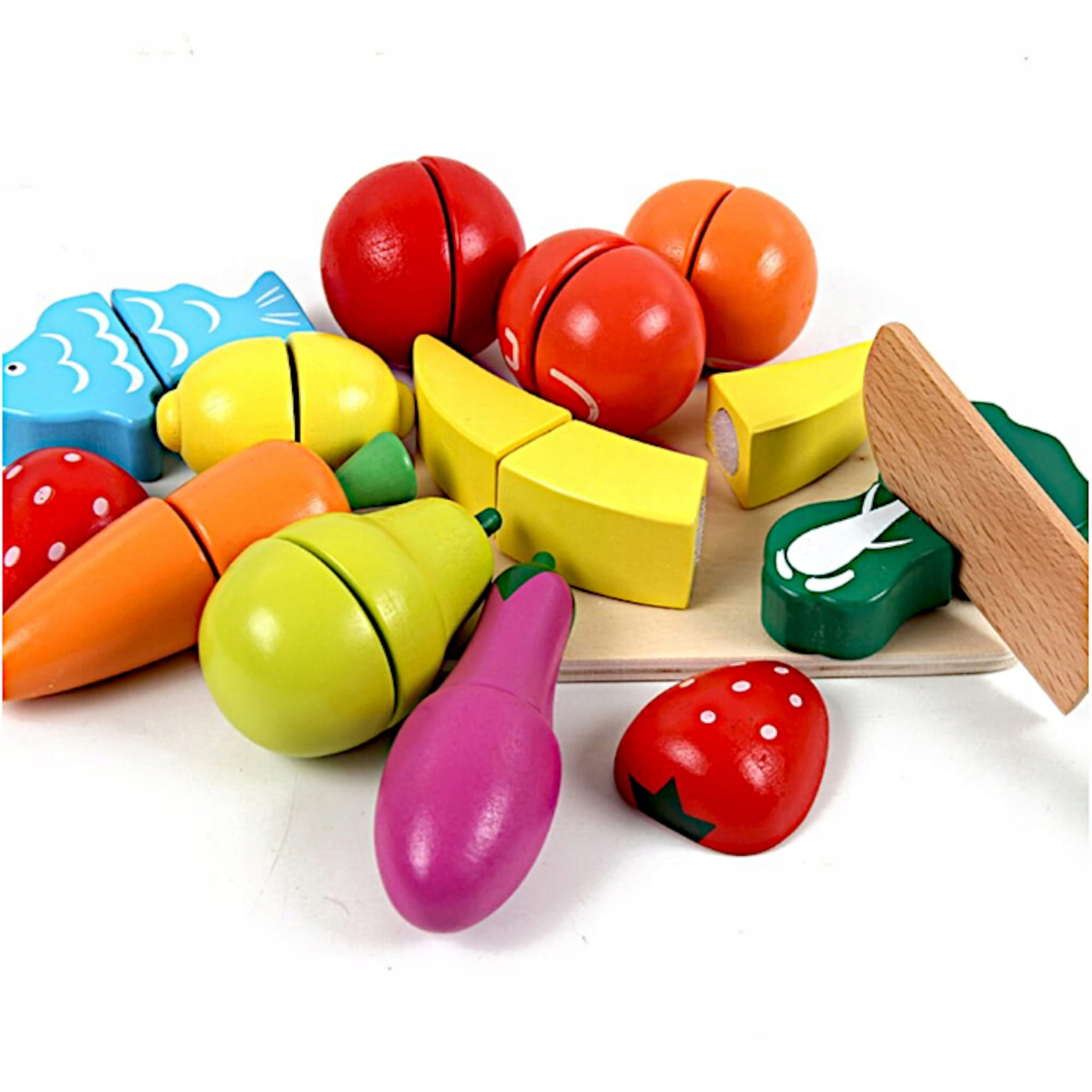 Praktyczny i bezpieczny zestaw drewnianych owoców i warzyw do krojenia, który z pewnością zainteresuje każde dziecko powyżej 3 lat. Elementy wykonane są z naturalnego drewna, pomalowane nietoksyczną farbą, pozbawione ostrych krawędzi.