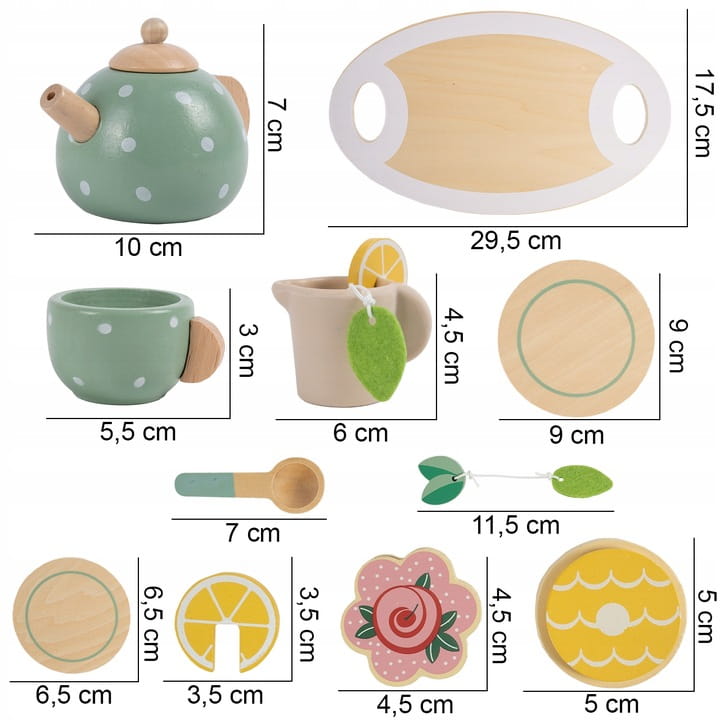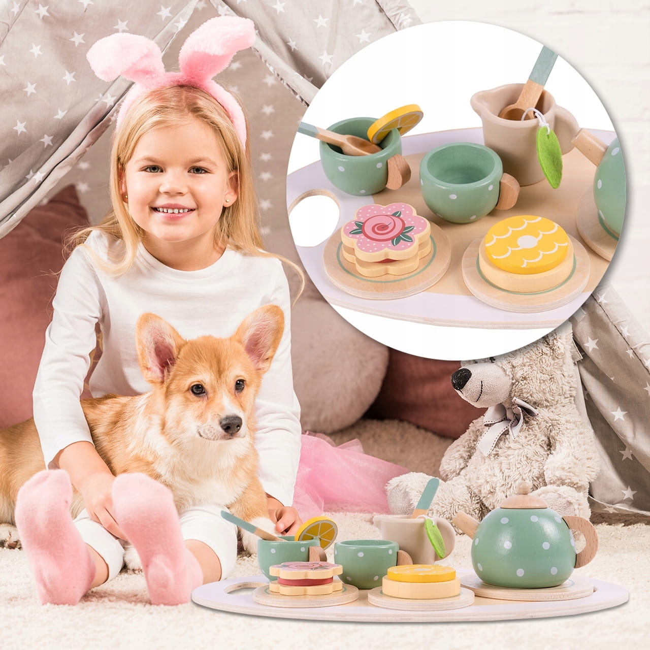 W zestawie jest wszystko, co trzeba: taca, czajniczek z pokrywką, filiżanki, spodki, łyżeczki, ciastka i cytrynka – czyli komplet na „prawdziwą” herbatkę.