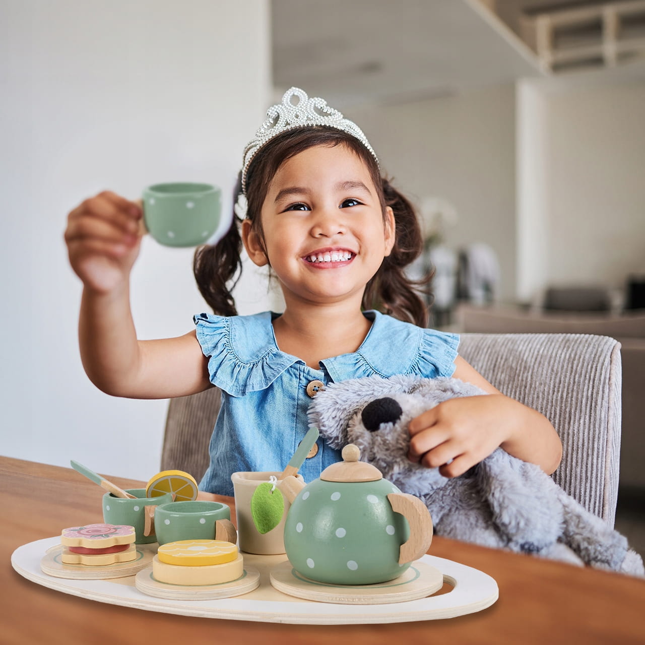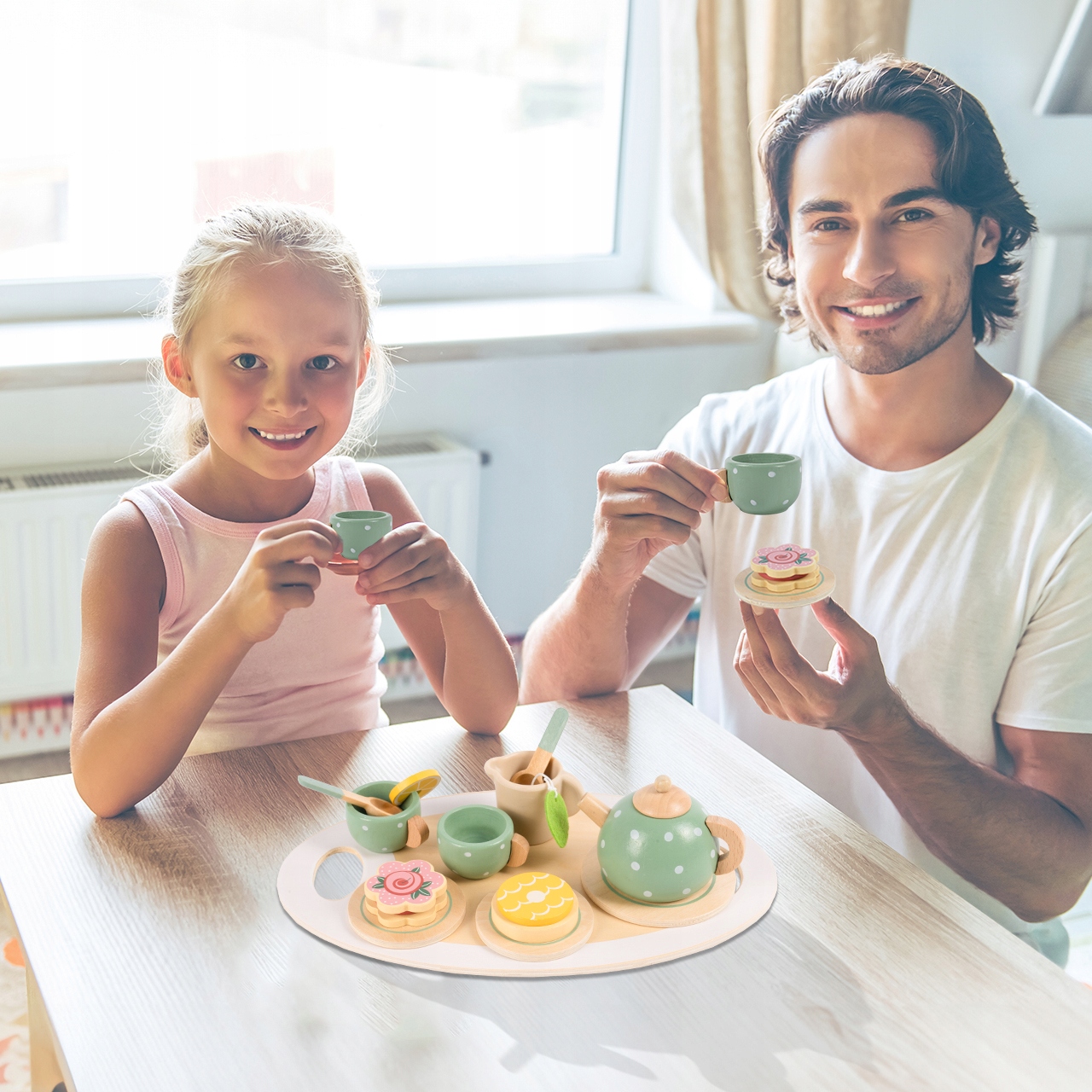 Dziecko przygotowuje herbatę, układa na tacce, częstuje – ćwiczy mówienie „proszę”, „dziękuję”, „smacznego”. To idealne do nauki zachowania przy stole i do zabawy z rodzicem.