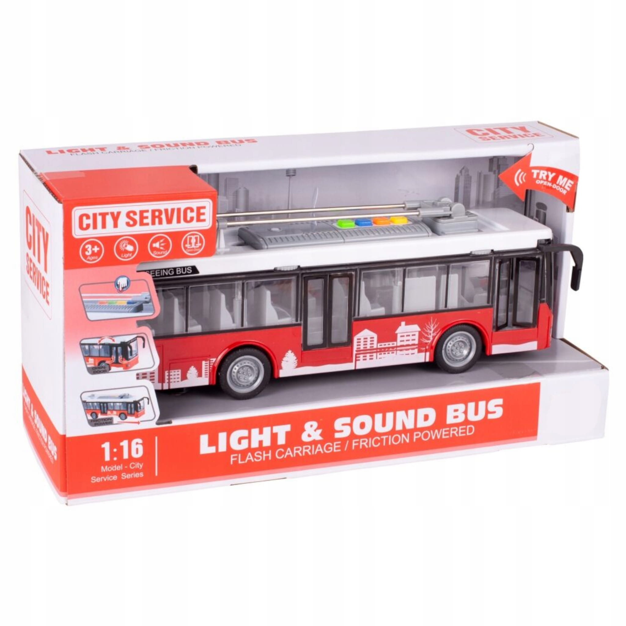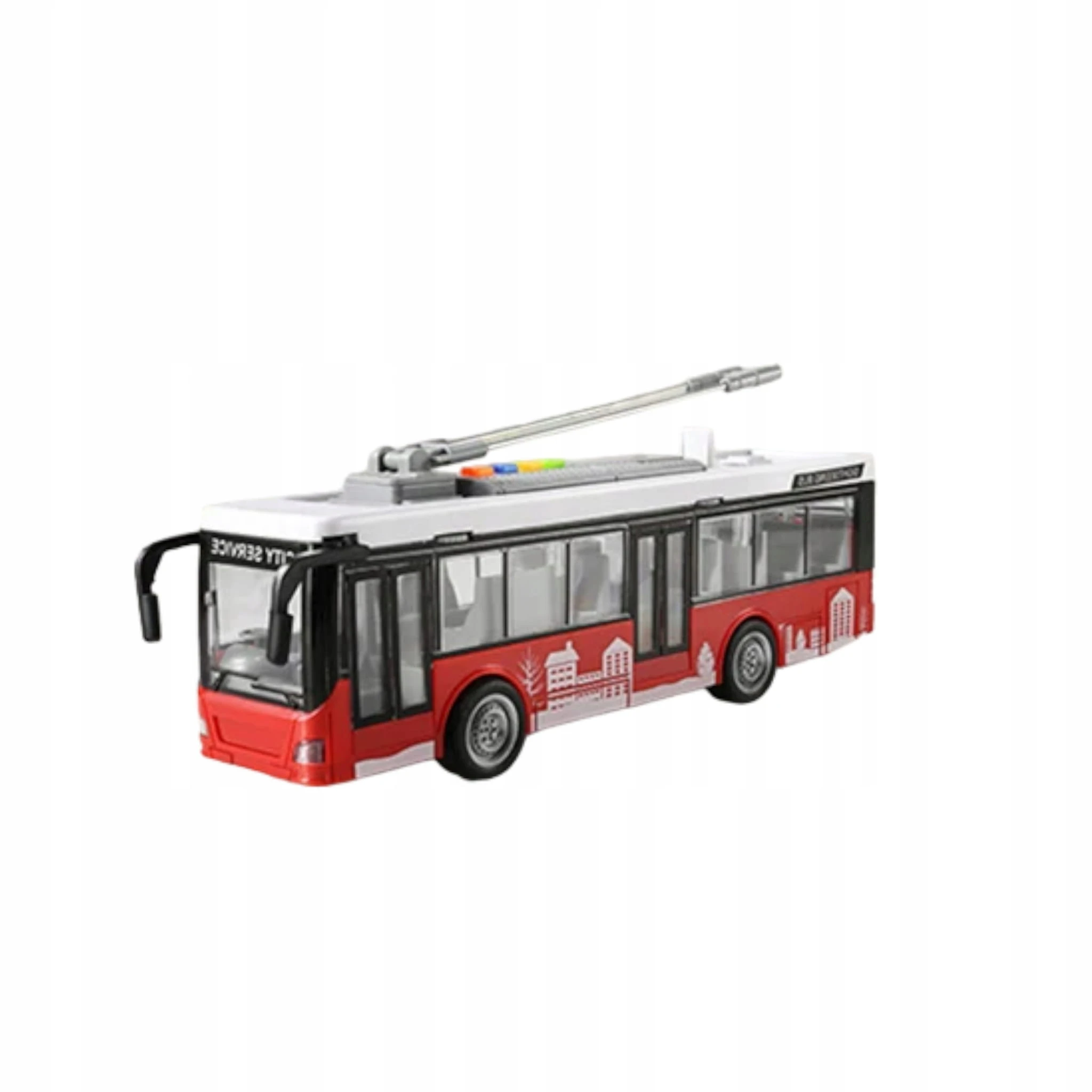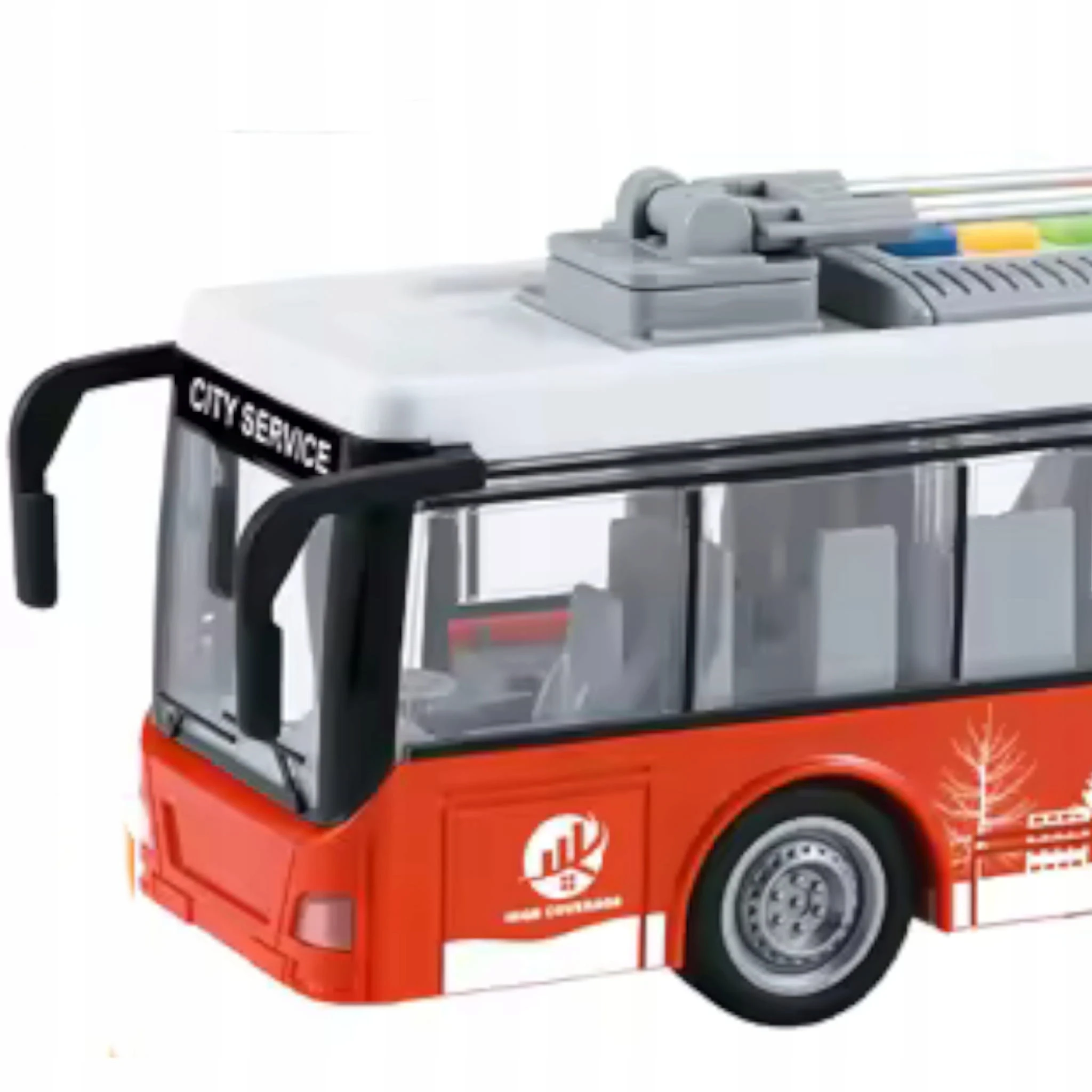 Świetny duży trolejbus CITY SERVICE, który jest odwzorowaniem prawdziwego miejskiego trolejbusu.