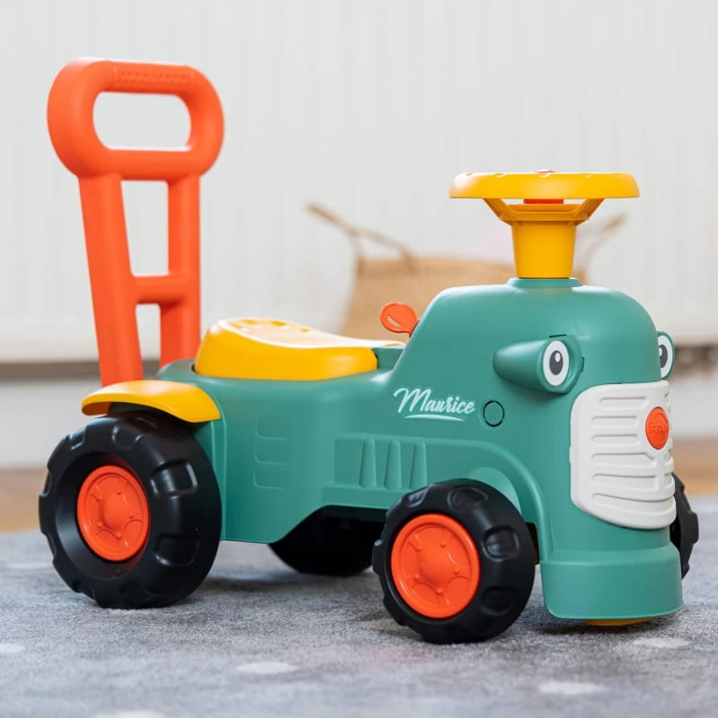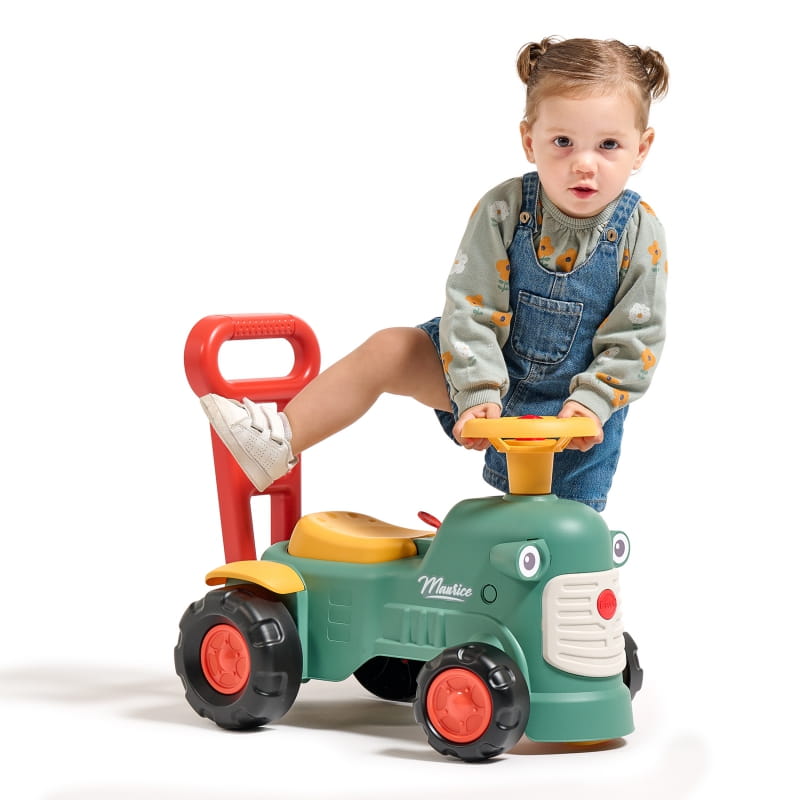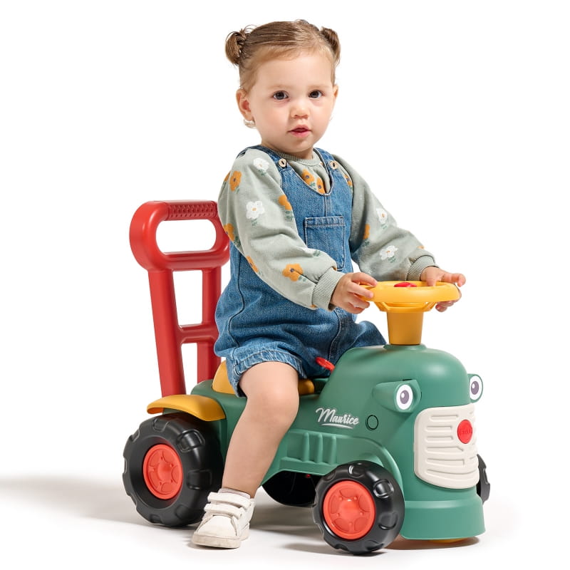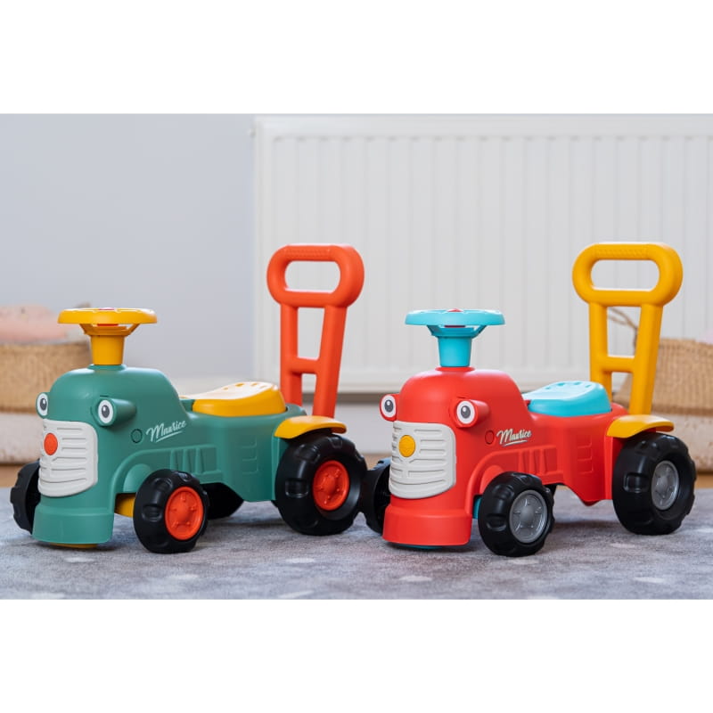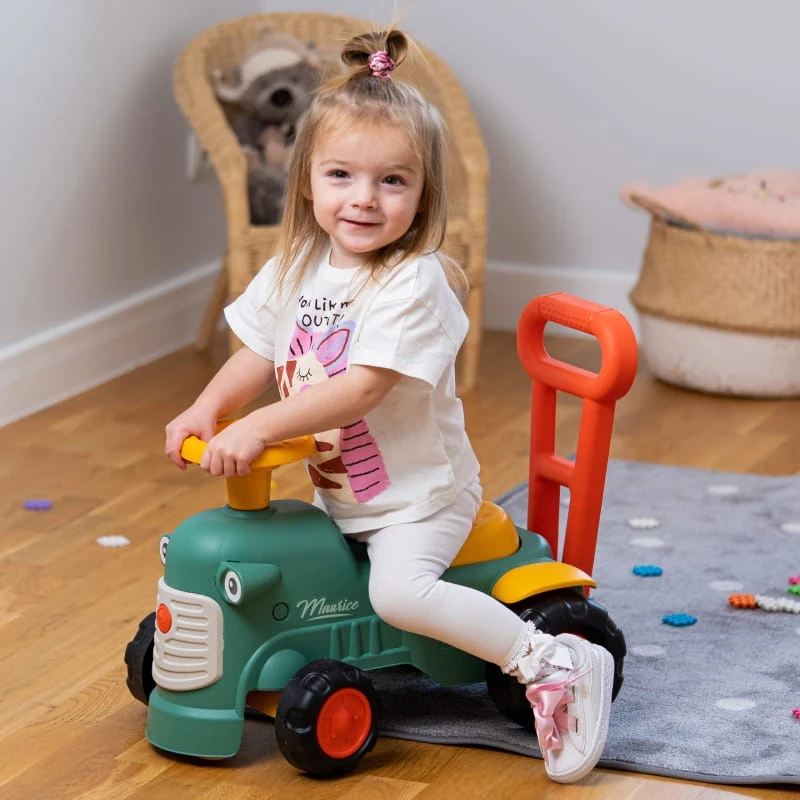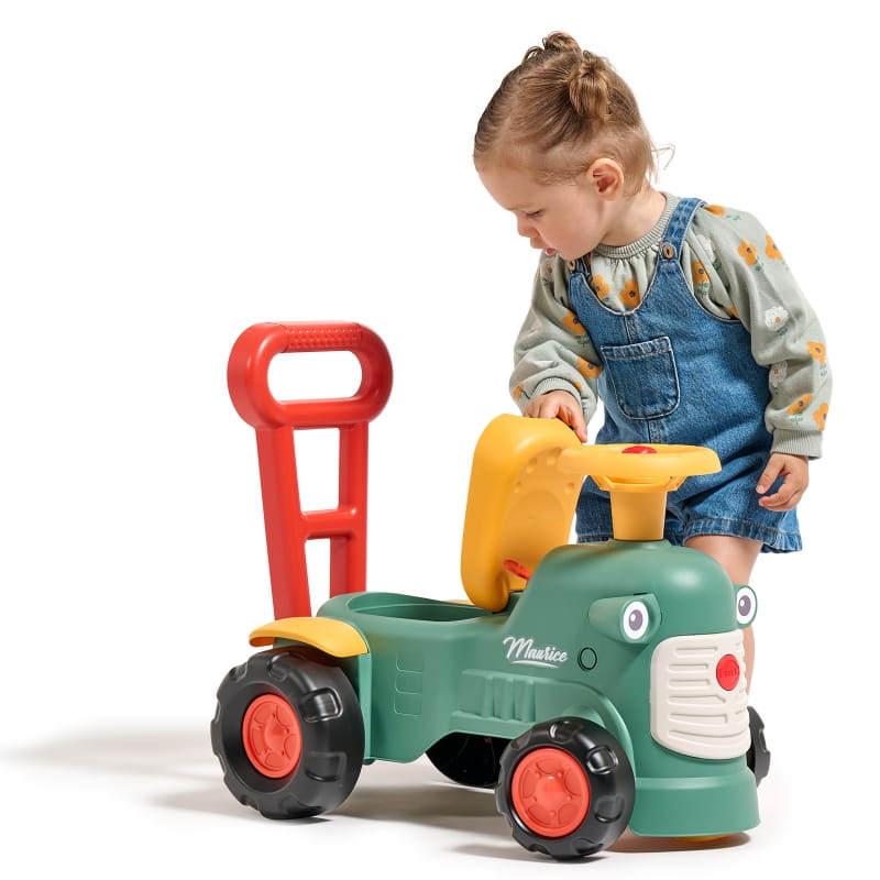Maurice to uroczy traktorek francuskiej marki Falk, który będzie towarzyszem pierwszych kroków Twojego dziecka. Jasne kolory i zaokrąglone kształty zachwycą każdego malucha. Uruchamianie traktora za pomocą małego pokrętła dźwiękowego oraz dźwięk z klaksonu umieszczonego na kierownicy to wspaniała pierwsza nauka, która pobudzi umiejętności motoryczne i słuch Twojego dziecka. Jeżdżąc na jeździku, bawiąc się kierownicą z klaksonem i skrętnymi kołami dziecko będzie ćwiczyło koordynację i równowagę. Stojąc z tyłu, może korzystać z ergonomicznego oparcia, aby uczyć się chodzić przez zabawę, bez strachu i całkowicie bezpiecznie. Pod siedzeniem znajduje się niewielki schowek do przechowywania skarbów.