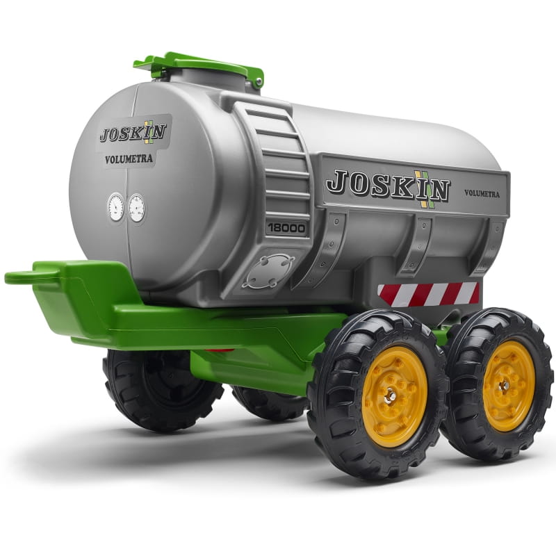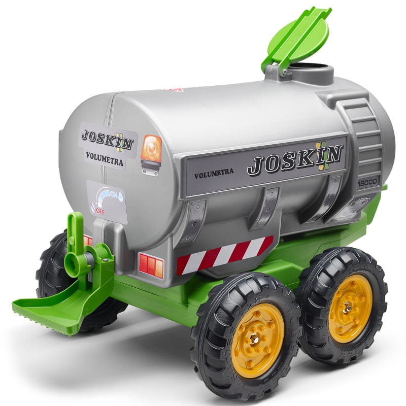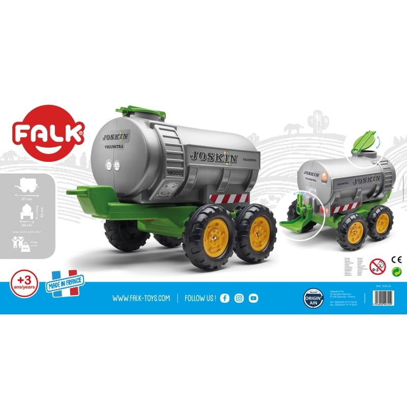 Przyczepa firmy Falk została wyprodukowana we Francji z wysokiej jakości materiału na licencji producenta maszyn rolniczych Joskin. Baw się nalewając wody do dużego zbiornika a następnie podlewaj uprawy. Cysterna Joskin pasuje do wszystkich traktorów FALK dla dzieci w wieku od 3 lat. Koła przyczepy zostały wykonane z wysokiej jakości plastiku.