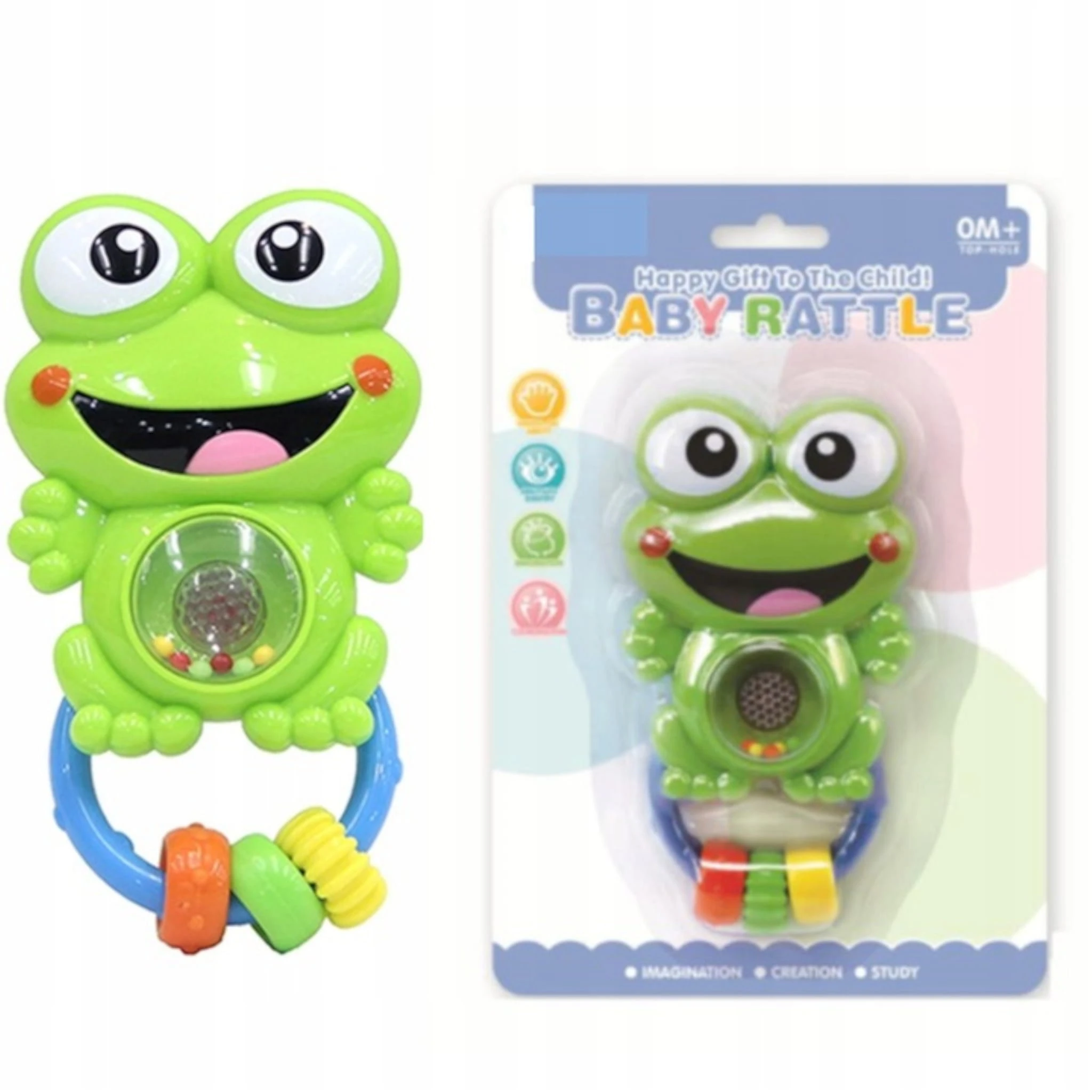 - Żabka posiada uchwyt w kształcie okręgu, który idealnie dopasowuje się do rączki. Znajdują się na nim 3 koraliki sensoryczne o różnych płaszczyznach.