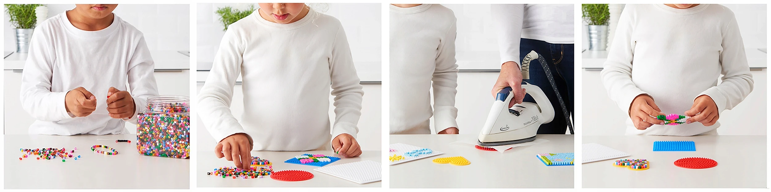 Na przygotowanej plastikowej formie z wypustkami układa się z koralików wybrany wzór. Dziecko może się tym zająć samo lub z przyjaciółmi. Gdy obrazek jest już skończony, przykrywamy go pergaminem do prasowania lub papierem do pieczenia i zaprasowujemy żelazkiem klasycznym (nie parowym!). Na tym etapie przyda się pomoc osoby dorosłej, chociaż starsze dzieci poradzą sobie same, mając np. małe żelazko turystyczne. Pod wpływem temperatury koraliki stopią się i po odklejeniu papieru otrzymamy gotowy obrazek. Aby koraliki wytopiły się poprawnie, należy zwrócić uwagę na temperaturę żelazka, jeśli zauważysz, że plastikowa podkładka zaczyna się wyginać lub topić natychmiast przerwij prasowanie.
