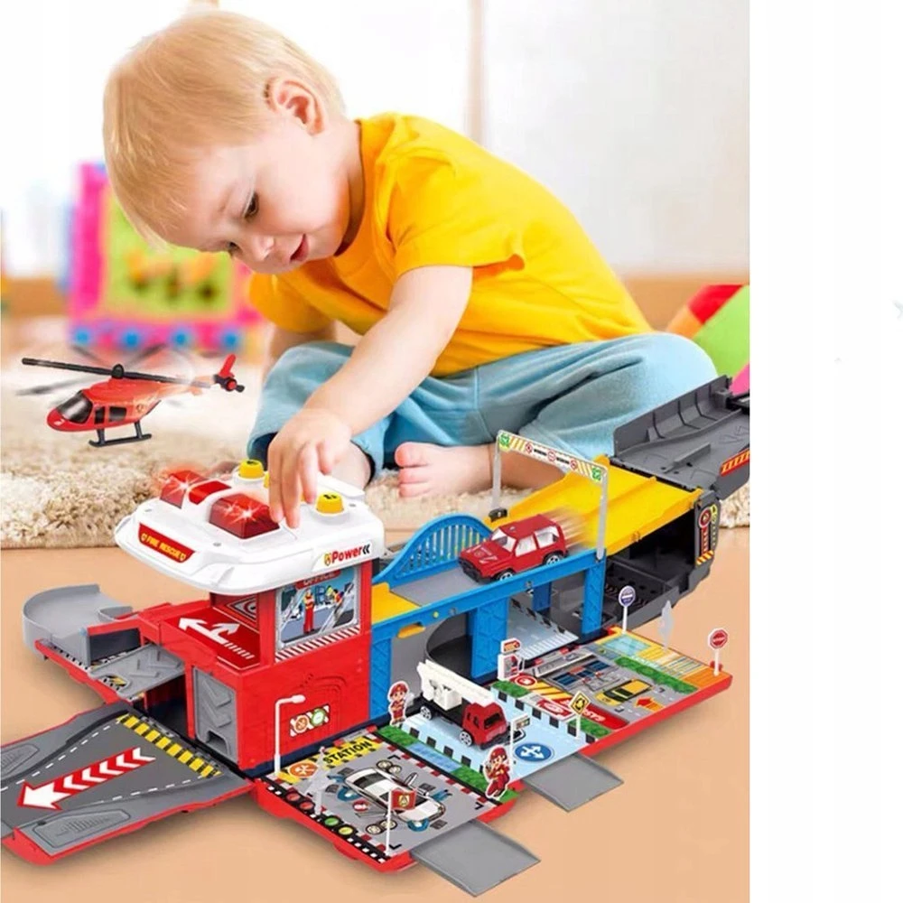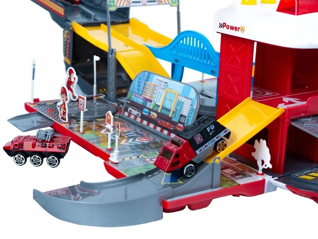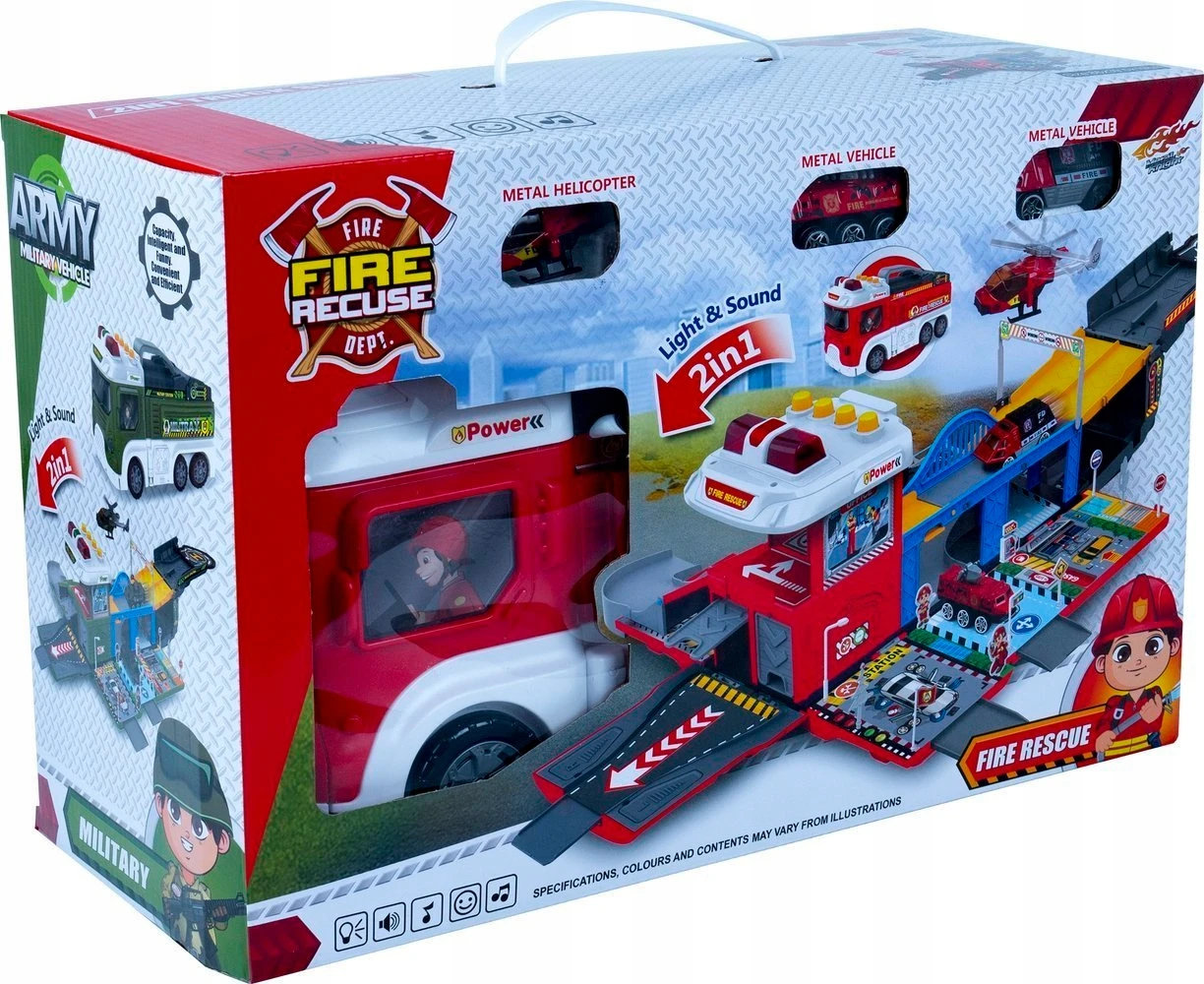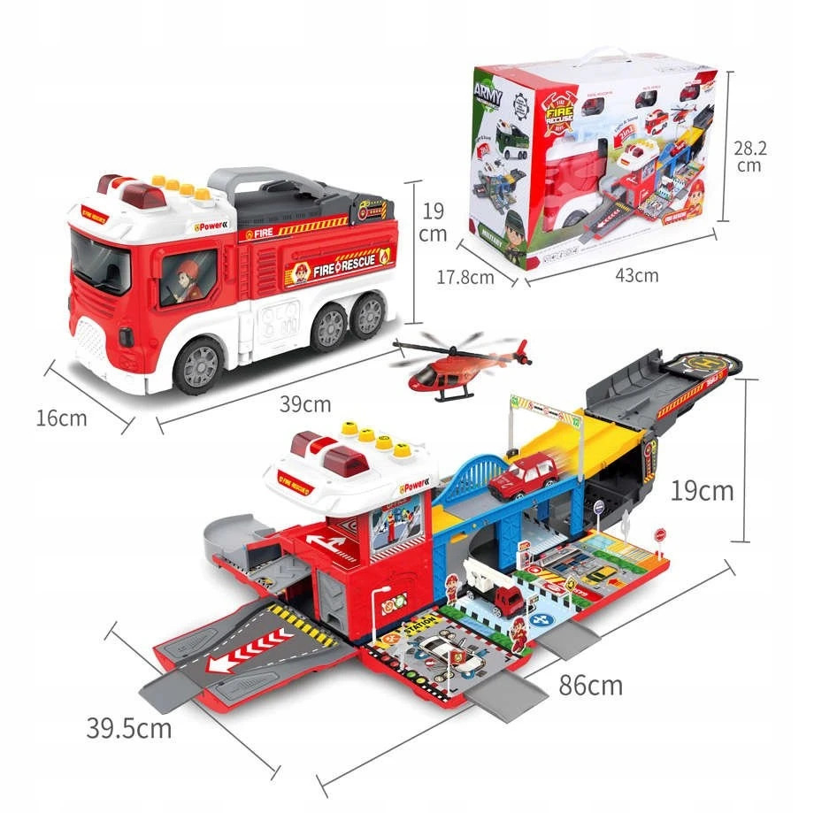 Interaktywna Straż Pożarna Transporter 2w1 Garaż Remiza + Resoraki METAL [LA-038 / LA-057]