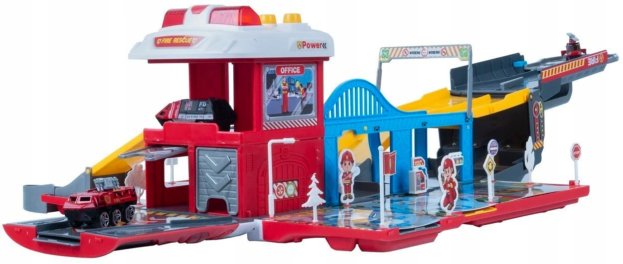 Zabawkowy wóz strażacki przekształca się w remizę strażacką z zjeżdżalniami oraz samochodzikami do zabawy.