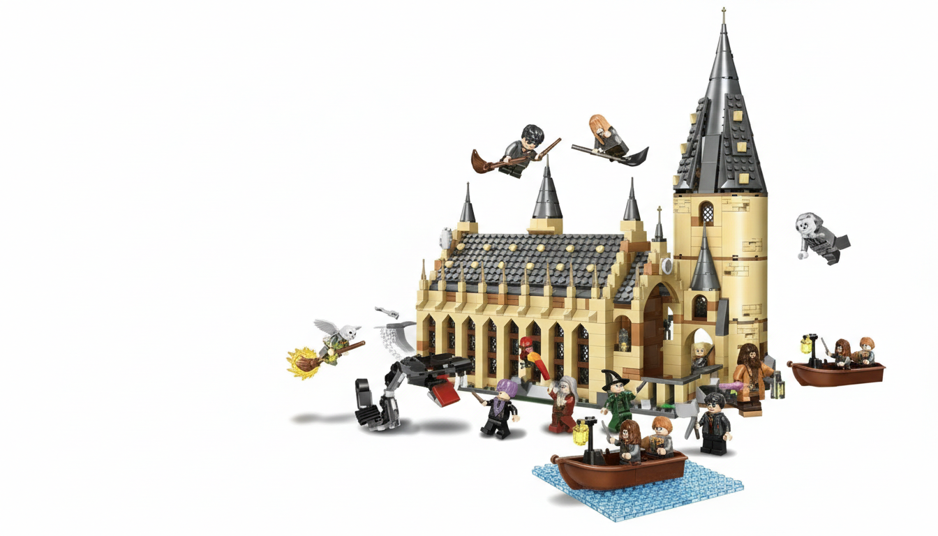 Akcesoria i dodatki: Zestaw zawiera liczne magiczne akcesoria, takie jak łódka, różdżki, zwierzęta (sowa, szczur) oraz elementy wyposażenia wnętrz, które ożywiają magiczny zamek.