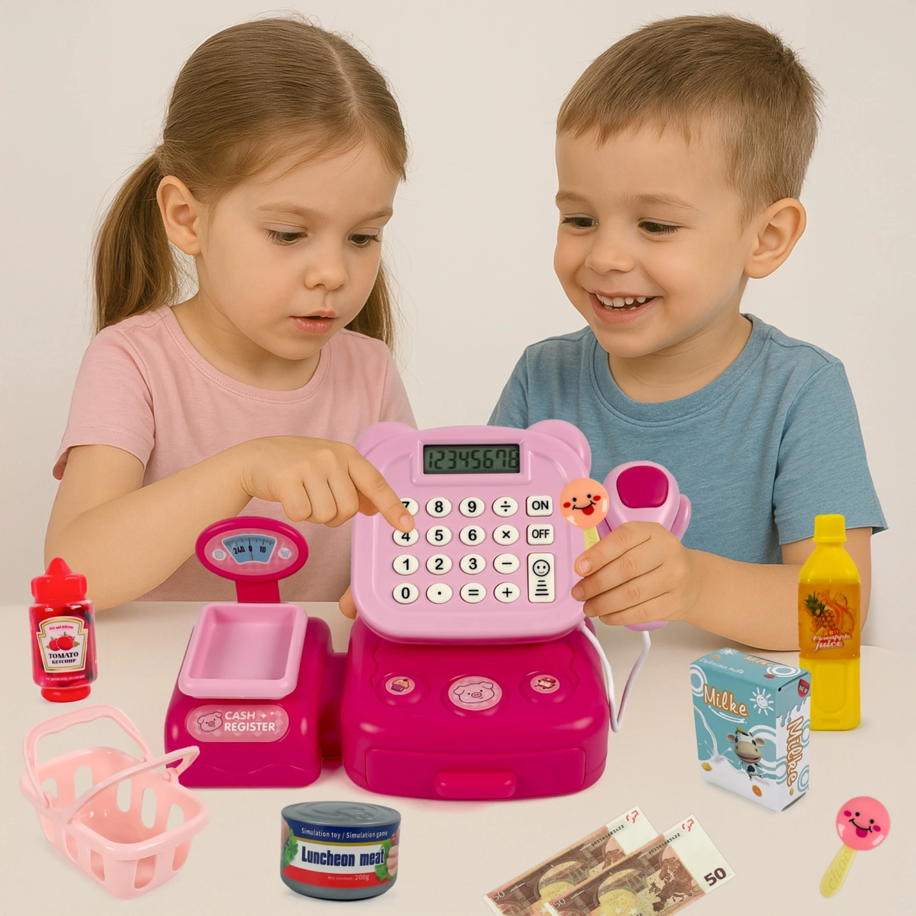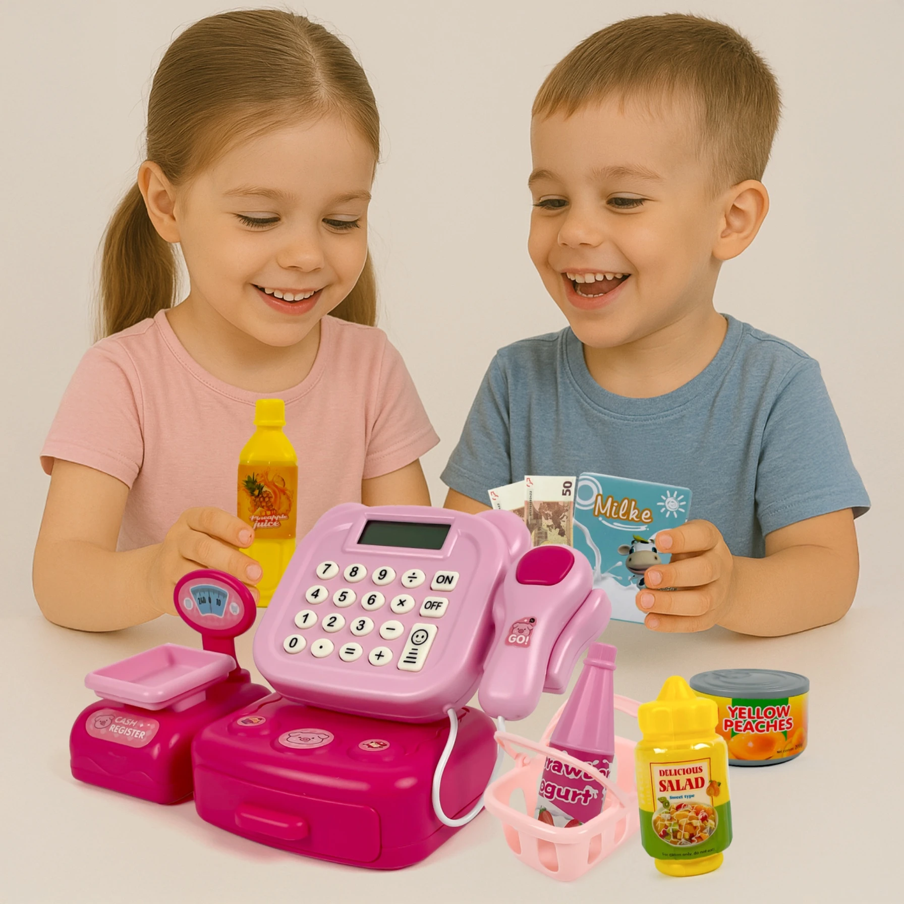 Zestaw do zabawy w sklep to nie tylko frajda, ale i nauka – liczenie, ważenie, płatności i odgrywanie ról rozwijają wyobraźnię i zdolności matematyczne dziecka.