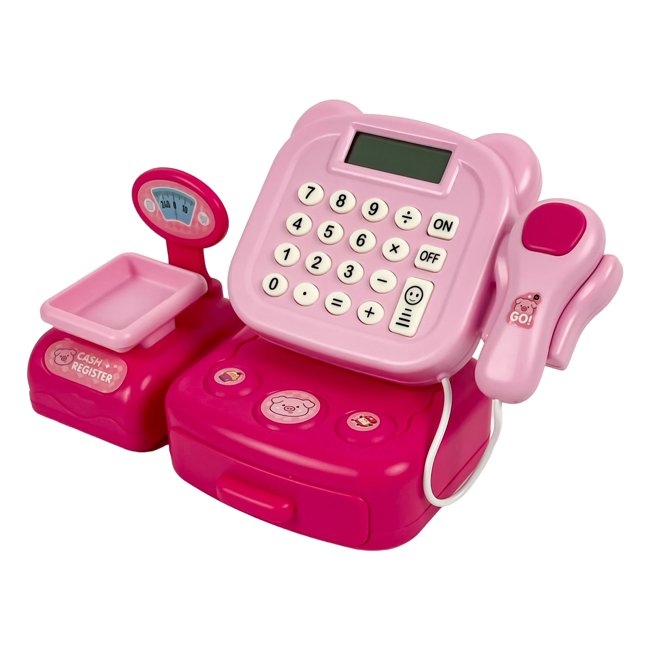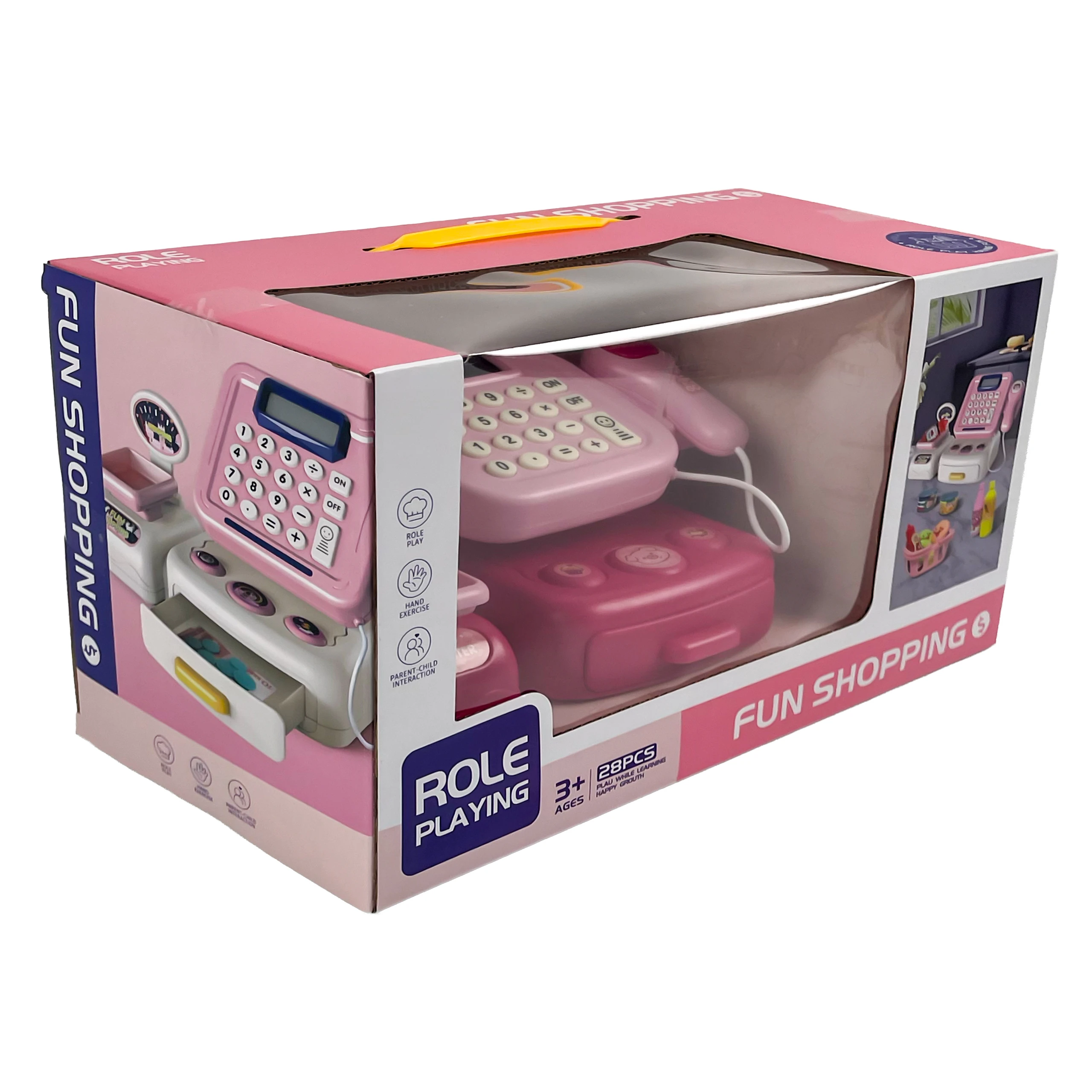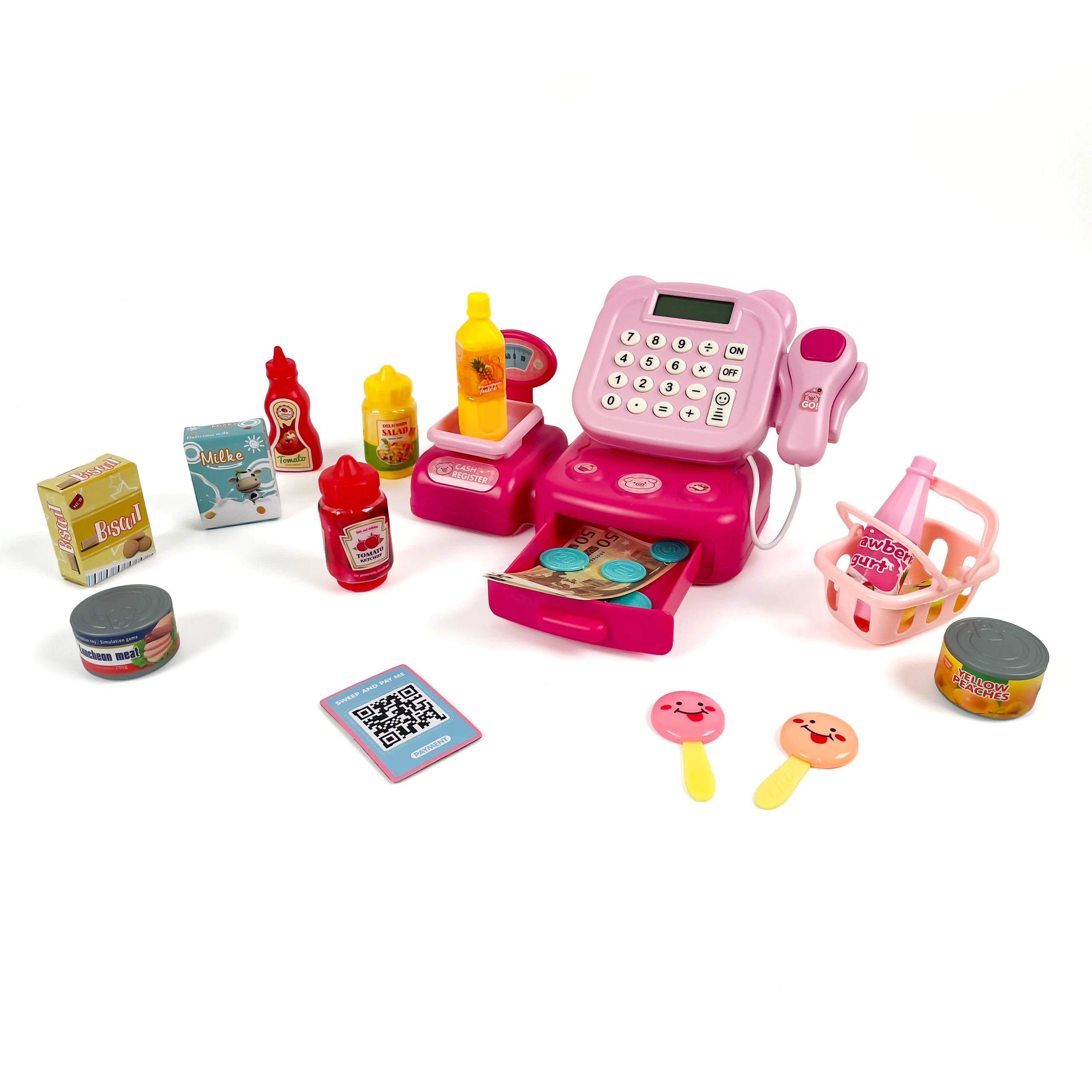Różowa kasa sklepowa z wagą, skanerem i 28 elementami – idealna do zabawy w sklep!