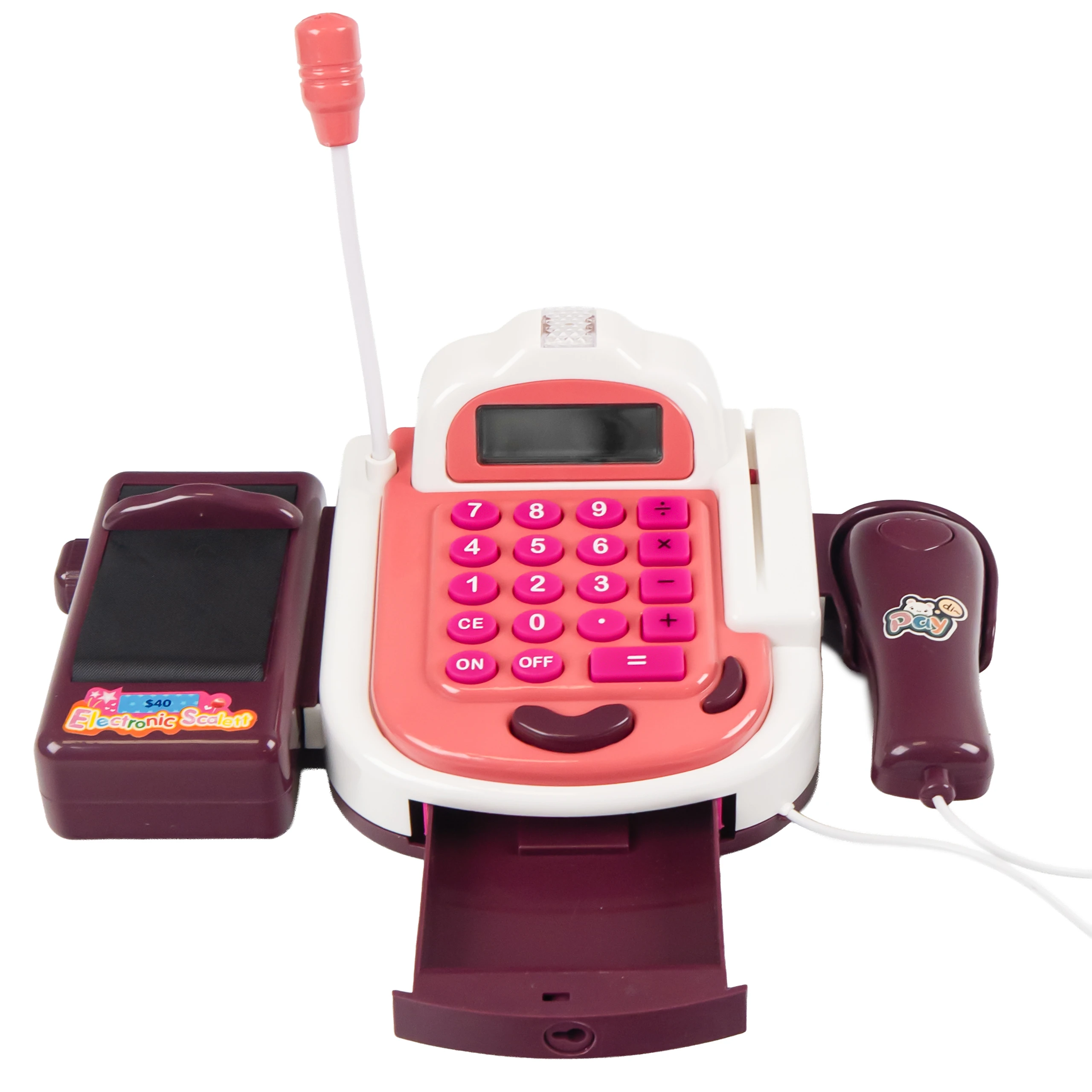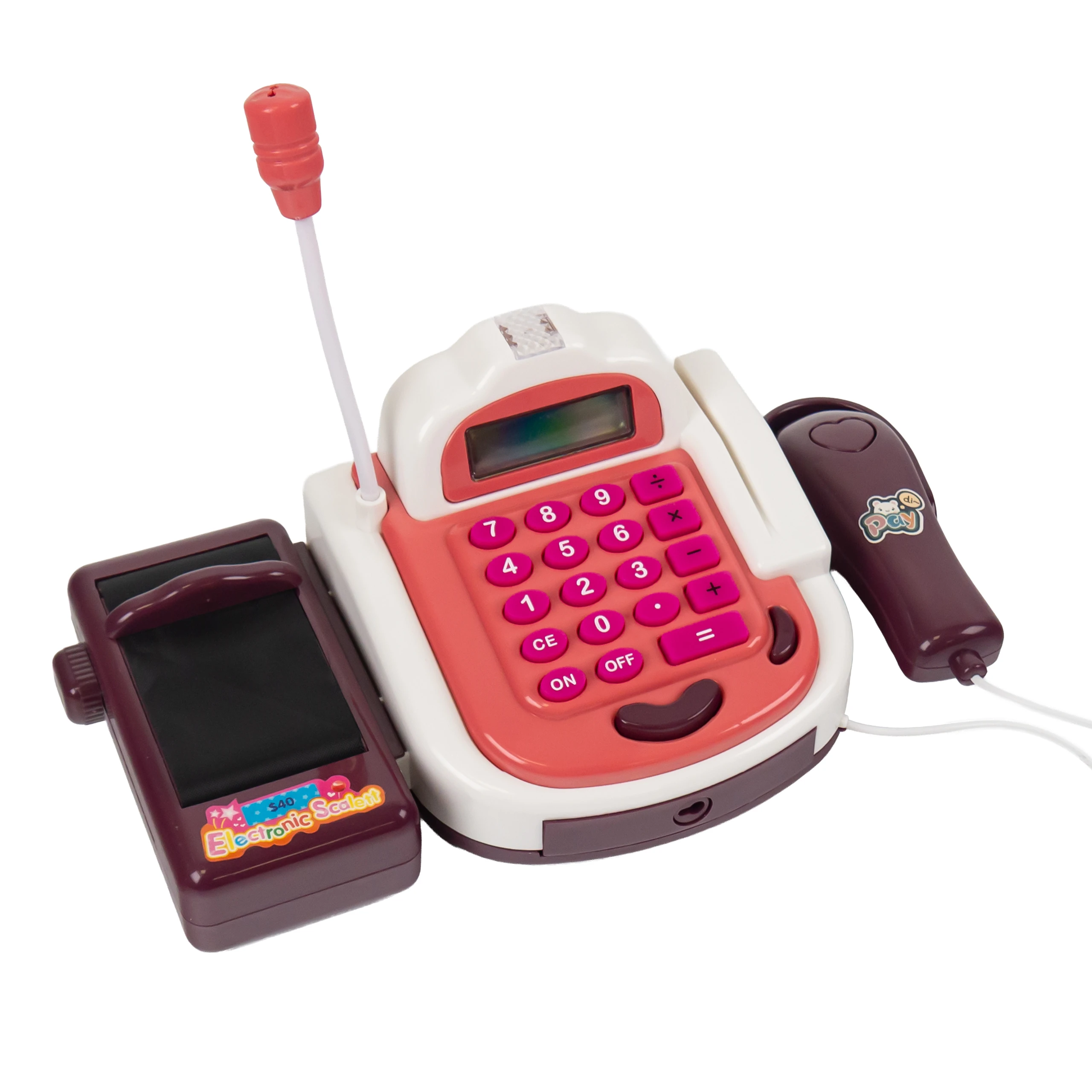 - Zabawkowa kasa fiskalna z wyświetlaczem i przyciskami.